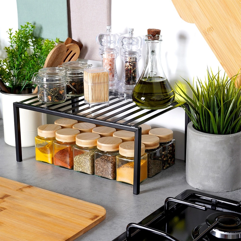 Táto univerzálna čierna kovová polička efektívne rozdelí výšku skrinky alebo plochu na linke na dve poschodia, takže získate viac úložného priestoru bez nutnosti ďalších zásahov. Vďaka pevnému prevedeniu je stabilná a spoľahlivá na každodenné používanie.