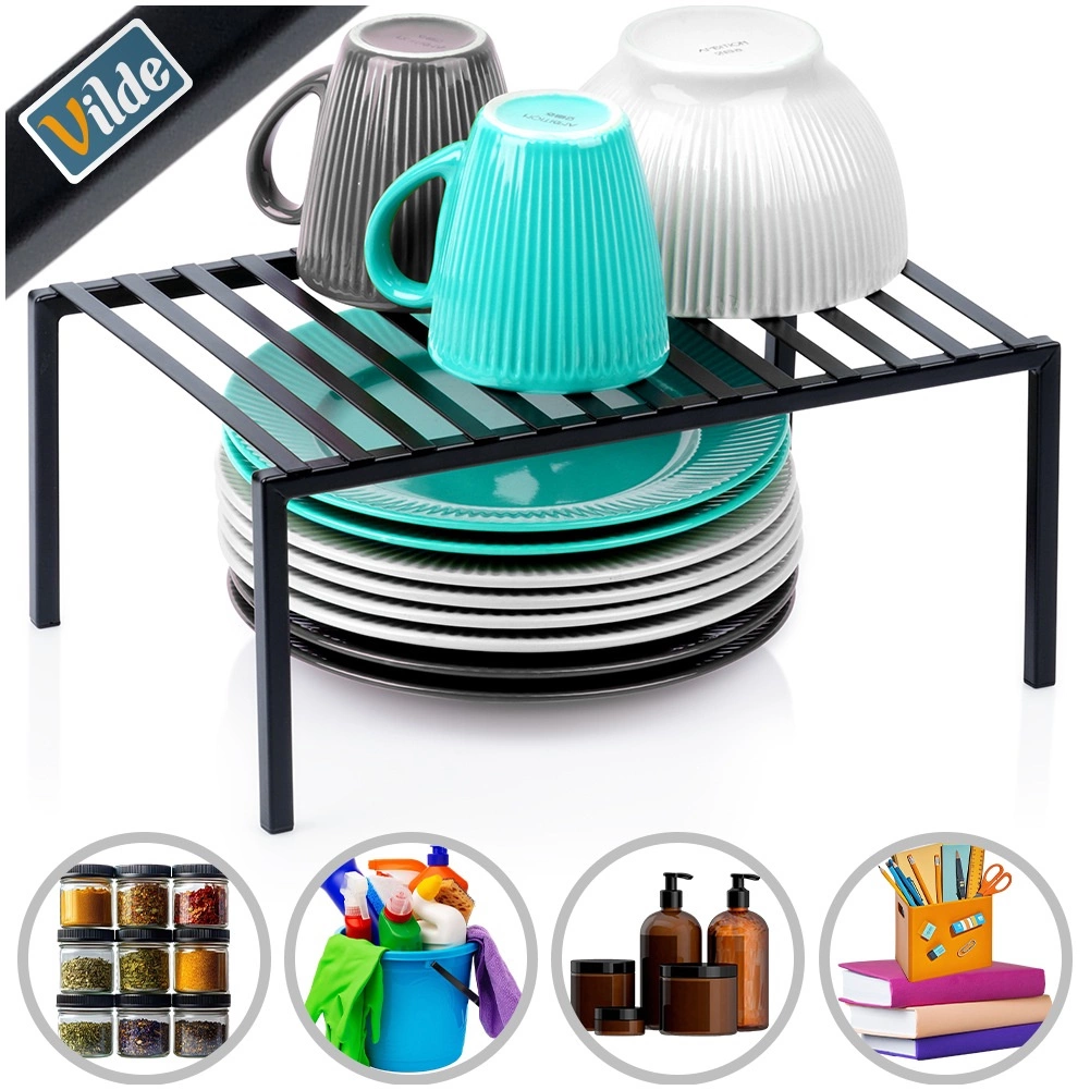 Rozdelí výšku police alebo pracovnej dosky a umožní prehľadne uložiť taniere dole a hrnčeky či misky hore.