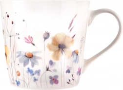 Elegantný porcelánový hrnček s objemom 430 ml s jemným dekorom lúčnych kvetov je ideálny na každodenné pitie čaju, kávy aj kakaa. Má pohodlné uško, klasický tvar a lesklú glazúru na jednoduché čistenie. Je vhodný do umývačky riadu aj mikrovlnnej rúry.