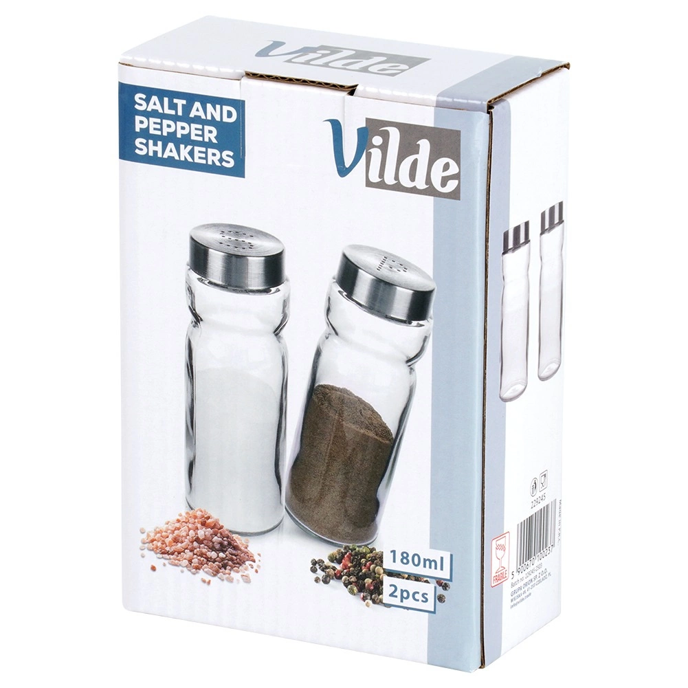 Objavte praktickú sadu dvoch koreničiek VILDE – soľničku a koreničku z kvalitného, silného skla s kovovými viečkami s nerezovým vzhľadom. Vďaka priehľadnému telu vždy vidíte množstvo korenia a môžete ho včas doplniť. Dávkovacie otvory vo viečku pomáhajú rovnomerne sypať a zabraňujú presoleniu či nadmernému okoreneníu.