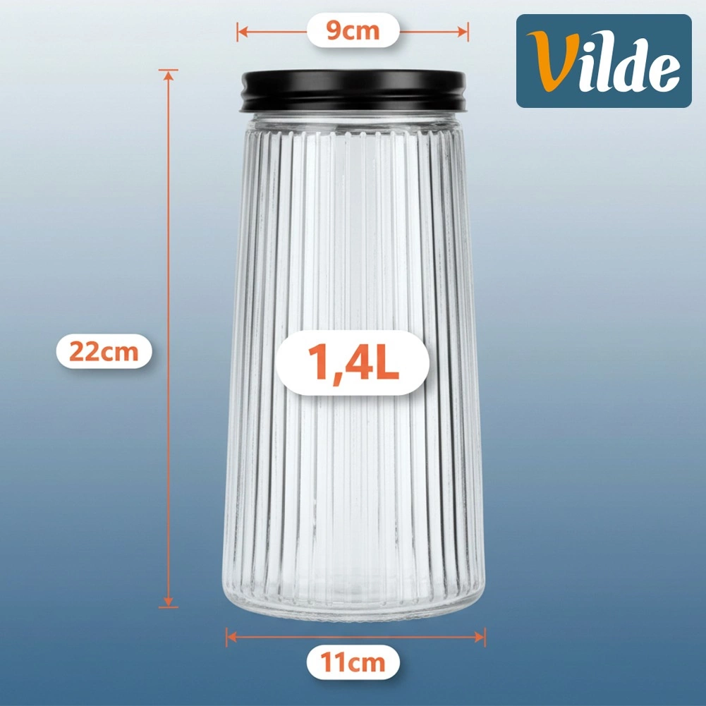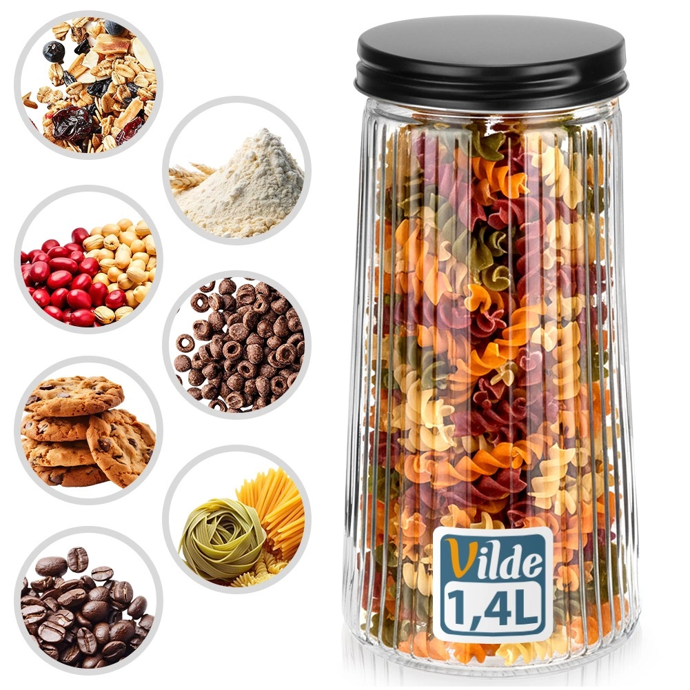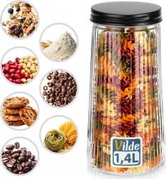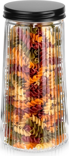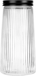 Elegantná sklenená dóza s objemom 1,4 l s čiernym skrutkovacím viečkom udrží vaše potraviny dlhšie čerstvé. Je vyrobená z odolného borosilikátového skla s dekoratívnym rebrovaním, ktoré zabezpečuje štýlový vzhľad aj bezpečný úchop. Vďaka vzduchotesnému uzatvoreniu je ideálna na kávu, cestoviny, múku, orechy či müsli a priehľadné sklo umožní rýchlu kontrolu obsahu.