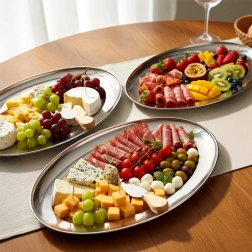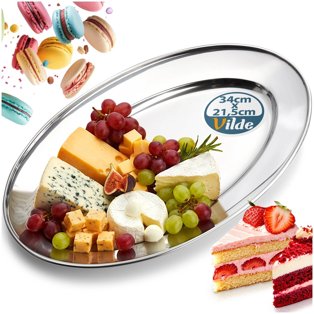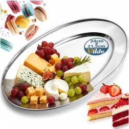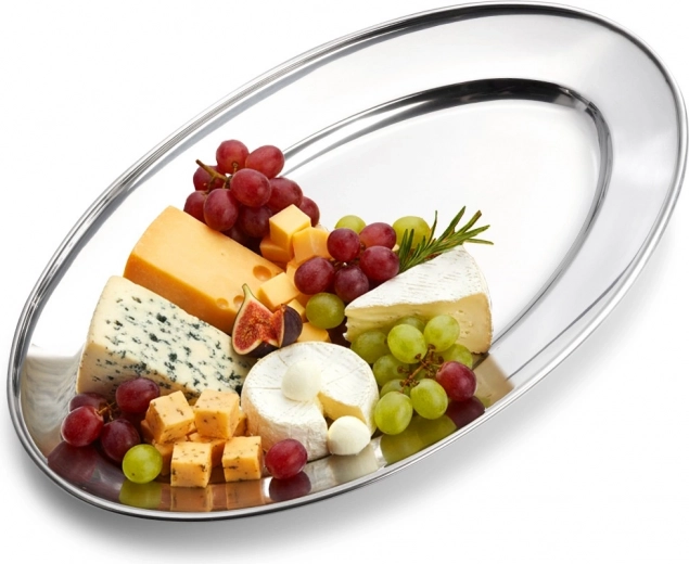 Elegantný oválny podnos z nehrdzavejúcej ocele s rozmermi 34 × 21,5 × 3 cm je ideálny na servírovanie predjedál, syrov, ovocia aj dezertov. Vďaka leštenému povrchu a vysokej odolnosti sa skvele hodí do domácnosti aj gastronómie a na každom stole pôsobí nadčasovo a štýlovo.