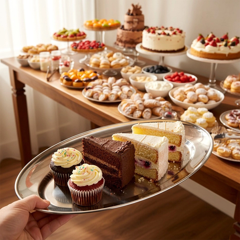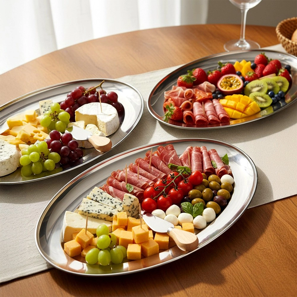 Štýlový oválny servírovací podnos z kvalitnej nehrdzavejúcej ocele vyniká lesklým, ľahko umývateľným povrchom a praktickým okrajom na bezpečné prenášanie. Je skvelou voľbou na každodenné použitie aj slávnostné príležitosti – od brunchov až po rodinné oslavy.