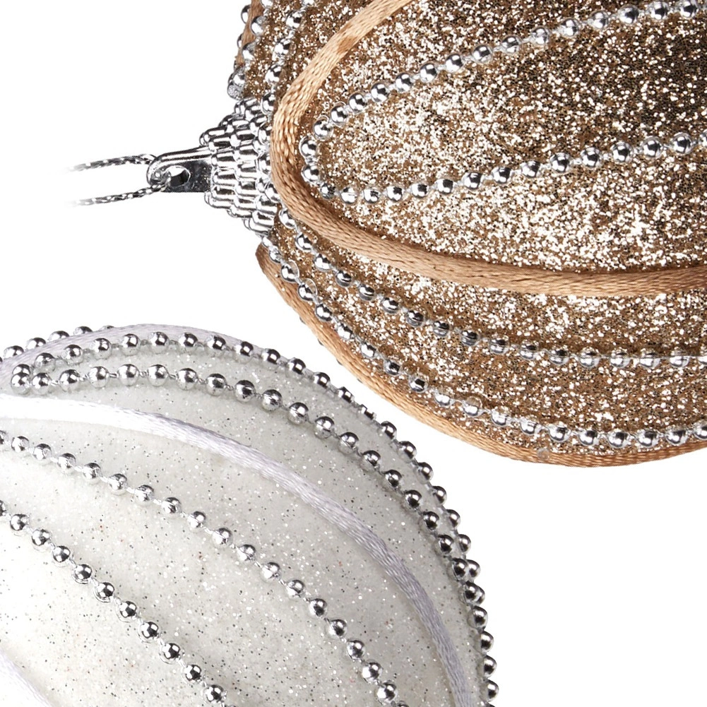 Dodajte svojej vianočnej výzdobe žiarivý, moderný aj nadčasový vzhľad. Sada 12 kusov v kombinácii bielej a šampanskej zlatej farby krásne odráža svetlo a vytvára sviatočnú atmosféru. Povrch s jemným brokátom a detailnou korálikovou výzdobou pôsobí luxusne a elegantne.