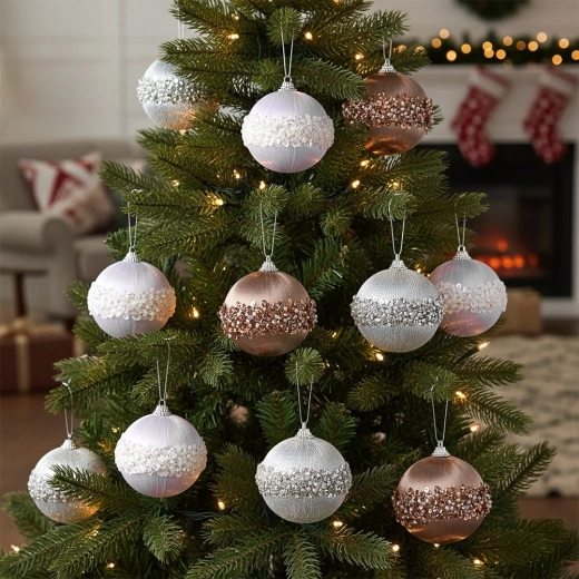 Elegantná sada vianočných gúľ s priemerom 8 cm v odtieňoch biela, strieborná a šampanská. Každá guľa je v ľahkom a nerozbitnom prevedení zo styroporu, potiahnutá saténovou tkaninou a zdobená širokým pruhom trblietavých korálikov a flitrov pre luxusný vzhľad. Ideálne na vianočný stromček, vence aj sviatočné aranžmány a skvelý tip na darček.