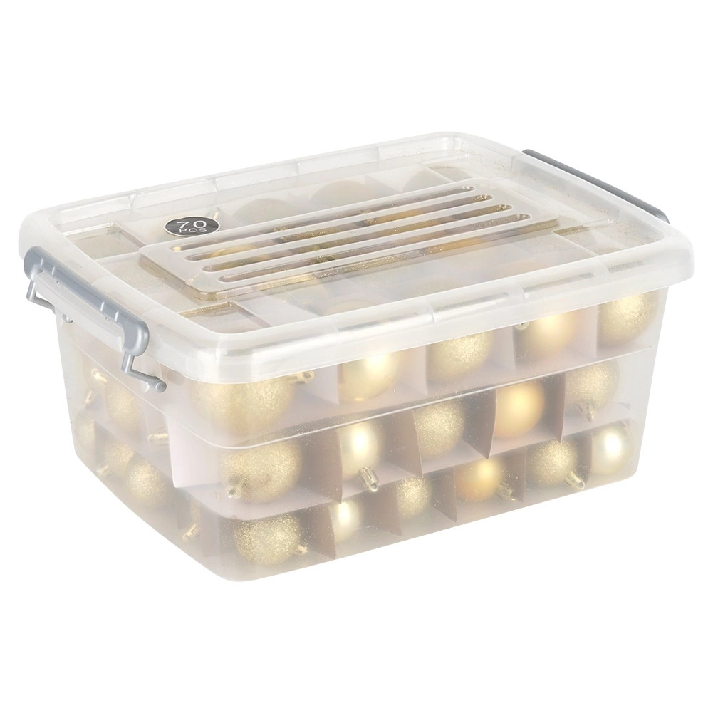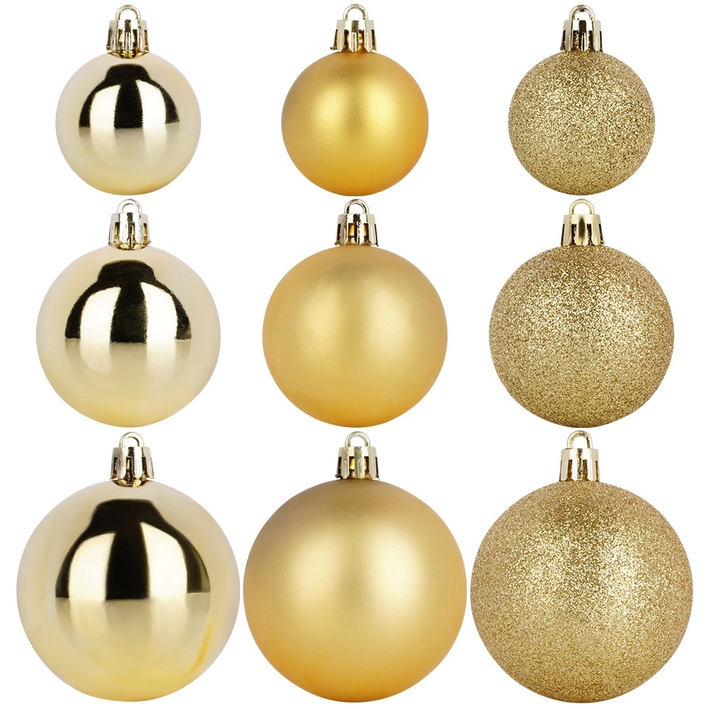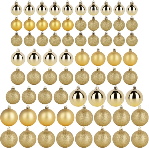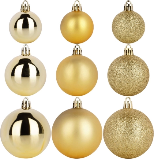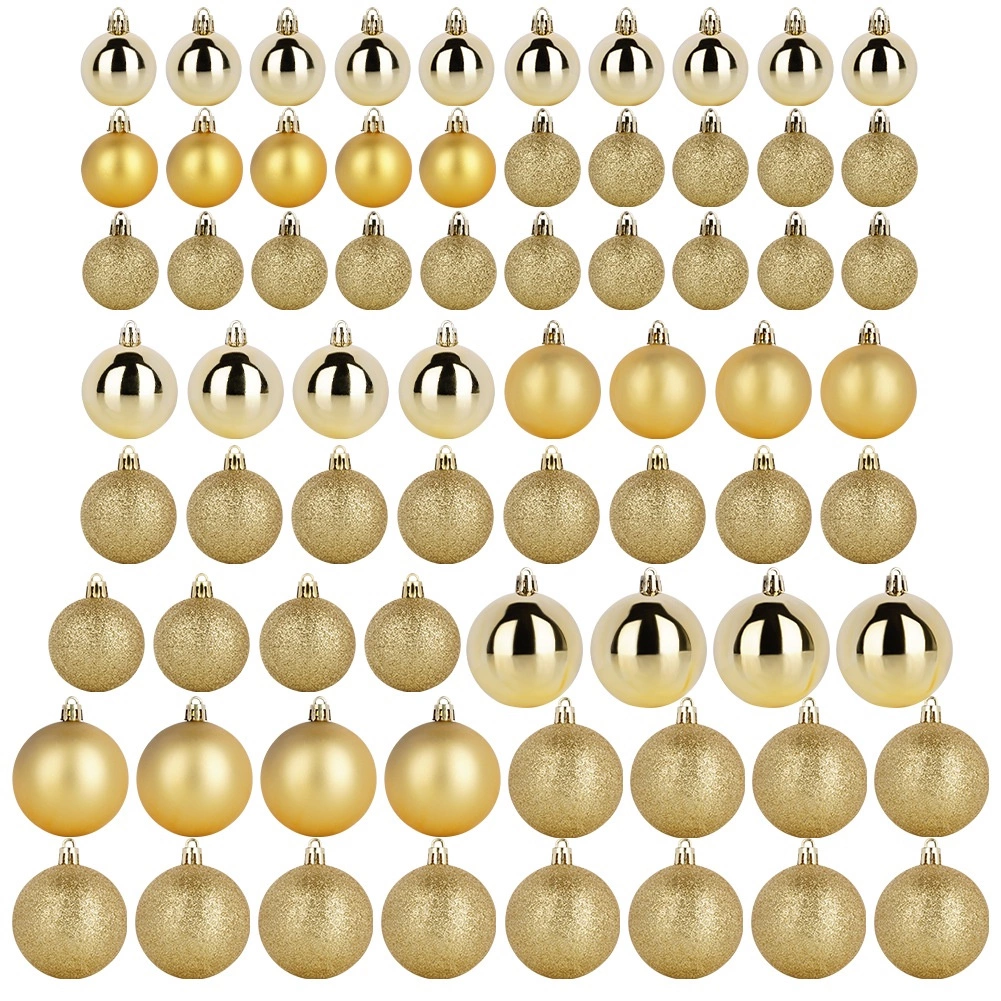 Štýlová sada vianočných ozdôb pre dokonalú výzdobu: 70 nerozbitných zlatých gúľ v troch veľkostiach a troch povrchových úpravách (mat, lesk, gliter) v praktickom úložnom boxe. Bezpečné pre deti aj domácich miláčikov, odolné proti rozbitiu a ideálne pre harmonickú a elegantnú dekoráciu každého stromčeka.