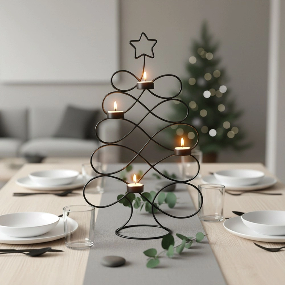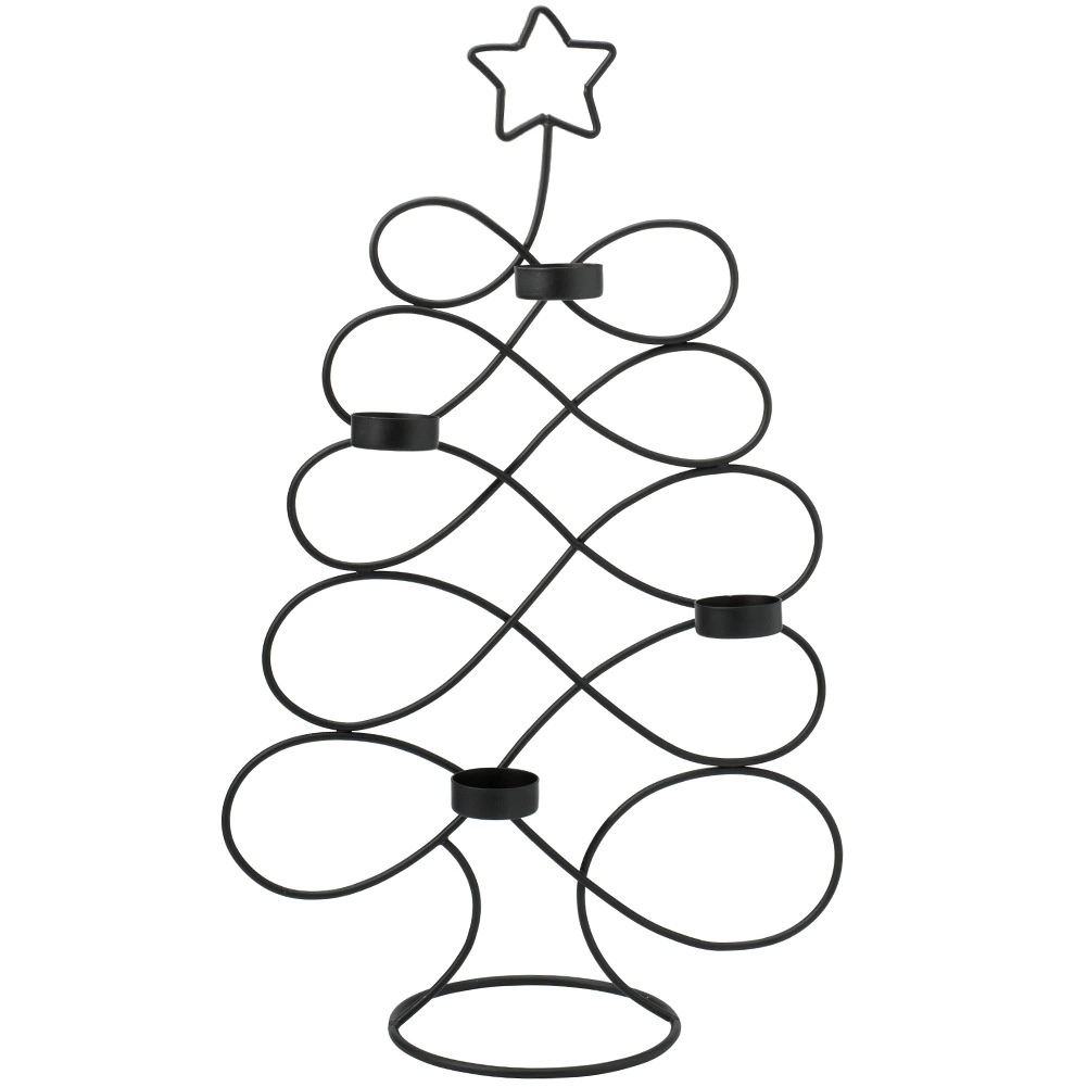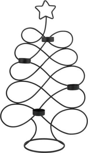 Elegantný kovový svietnik v tvare stromčeka s výškou 49 cm so štyrmi miestami na čajové sviečky vytvára útulnú atmosféru a modernú sviatočnú dekoráciu. Minimalistický dizajn v čiernej farbe dokonale ladí s interiérmi v štýle loft aj skandi a vďaka stabilnej základni zaručuje bezpečné používanie.