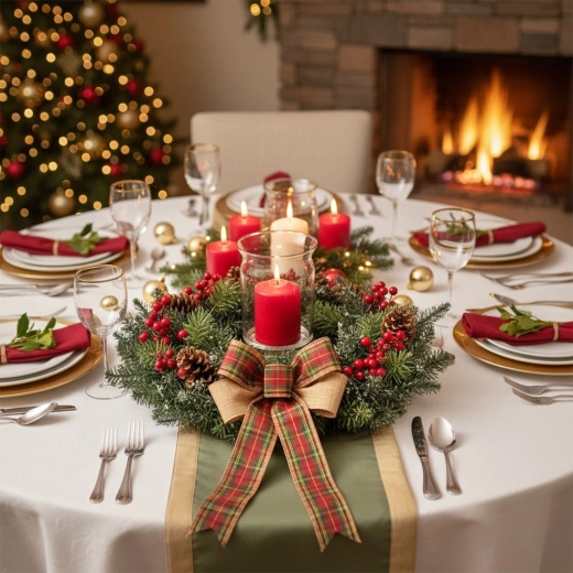 Bohatá kompozícia prírodných ozdôb – okrúhle aj podlhovasté šišky a vetvičky s červenými bobuľami – dodáva dekorácii lesný, elegantný a naozaj vianočný charakter. Veniec je univerzálny: skvele vynikne na vstupných dverách, nad krbom aj ako stolový stred so sviečkami.