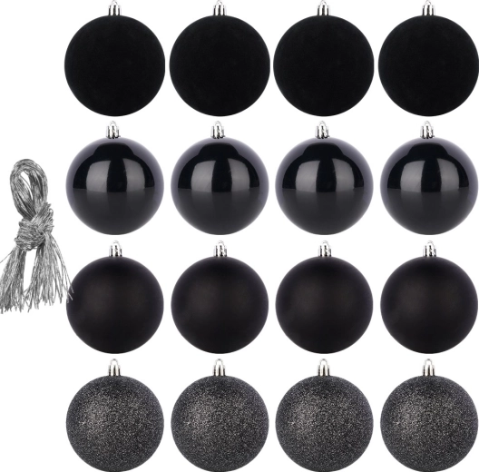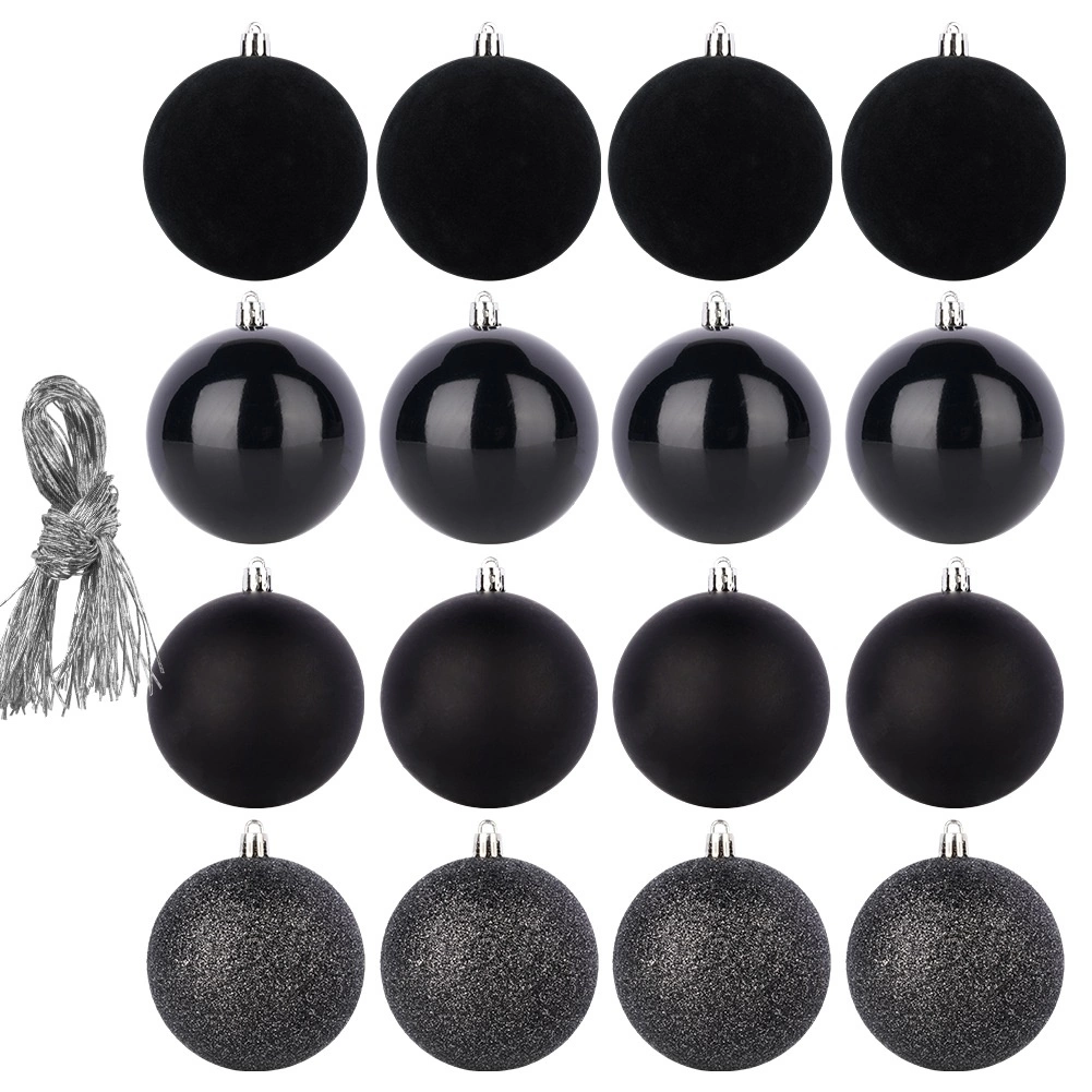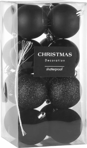 Elegantná sada 16 čiernych vianočných gulí s priemerom 6 cm v matnom, lesklom, trblietavom a zamatovom prevedení. Vďaka nerozbiteľnému materiálu sú bezpečné pre domácnosti s deťmi a miláčikmi a dodajú vašej výzdobe štýlový, sviatočný lesk.