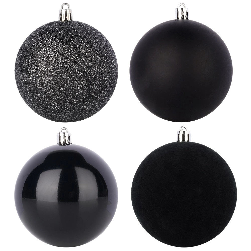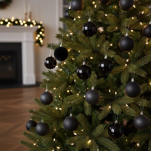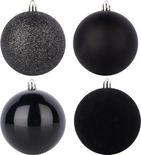 Táto sada prináša harmonickú kombináciu povrchov: 4× matné, 4× lesklé, 4× trblietavé a 4× zamatové gule. Jednotný čierny tón pôsobí moderne a elegantne, ľahko sa kombinuje s ďalšími farbami a vytvára okúzľujúcu sviatočnú atmosféru.