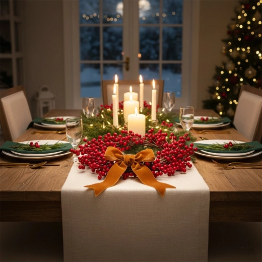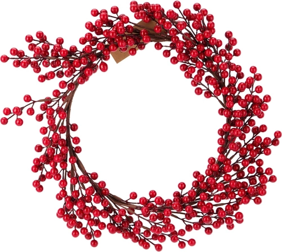 Elegantný vianočný veniec s priemerom 50 cm z hustých vetvičiek s drobnými plodmi cezmíny je výraznou sviatočnou dekoráciou na dvere, stenu aj stôl. Vďaka trvácnemu prevedeniu si zachová farbu aj tvar počas mnohých sezón. Jeho sýto červené odtiene okamžite rozžiaria interiér a vytvoria sviatočnú atmosféru.