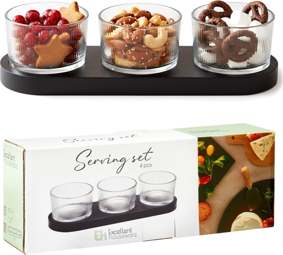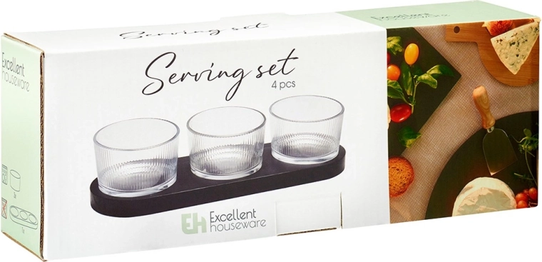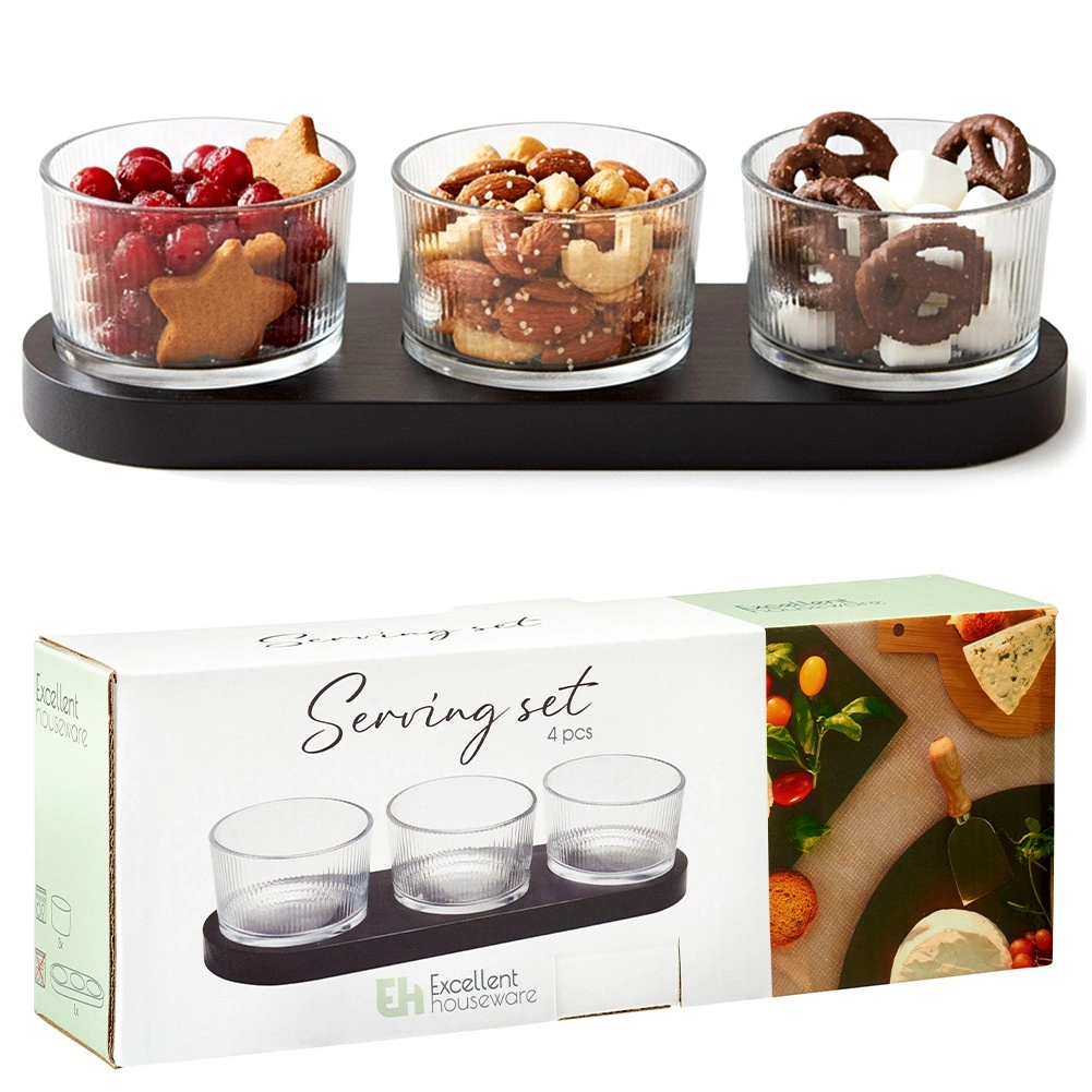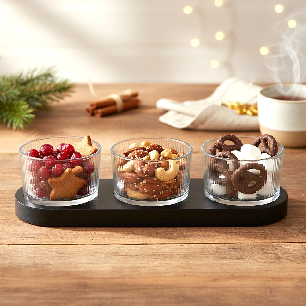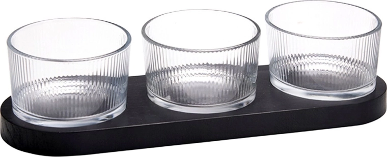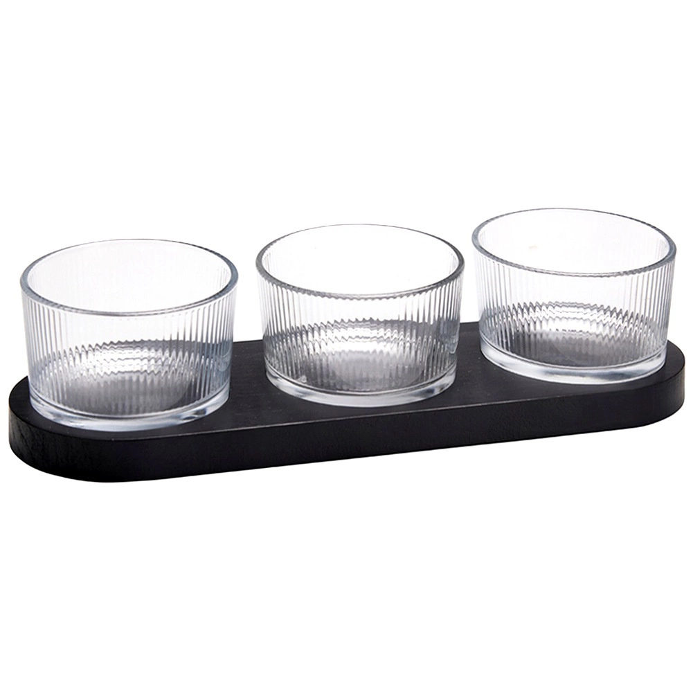 Elegantná 4-dielna sada na servírovanie občerstvenia kombinuje tri sklenené mištičky a obdĺžnikový drevený táck v čiernej farbe. Ideálna na dipové omáčky, olivy, oriešky a antipasti. Moderný dizajn s ryhovaným sklom a praktické výsady pre stabilitu misiek zaručujú pohodlné a štýlové podávanie.