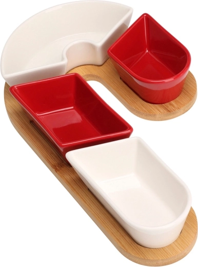 Štýlová 5-dielna servírovacia sada s bambusovou táckou v tvare cukrovej palice premení váš stôl na sviatočnú ozdobu. Obsahuje štyri odolné keramické mištičky v červenej a bielej farbe a presne tvarovanú bambusovú dosku pre stabilné uloženie. Ideálna na pochutiny, dipy, omáčky aj antipasti. Celkový rozmer setu: 29 × 17 × 4,5 cm.