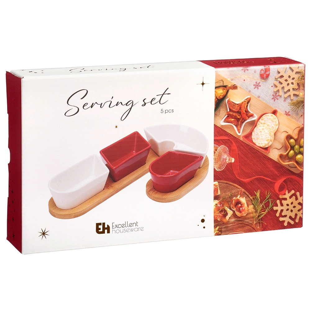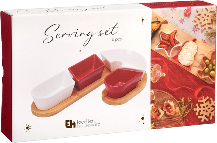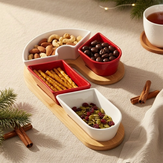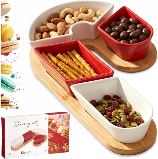 Vytvorte nezameniteľnú sviatočnú atmosféru s elegantnou servírovacou sadou v tvare cukrovej palice. Keramické mištičky v klasickej kombinácii bielej a červenej farby skvelo doplnia váš stôl, zatiaľ čo bambusová doska s vyfrézovanými lôžkami udrží všetko bezpečne na mieste. Praktické aj dekoratívne riešenie pre rodinné večere, návštevy aj vianočné večierky.