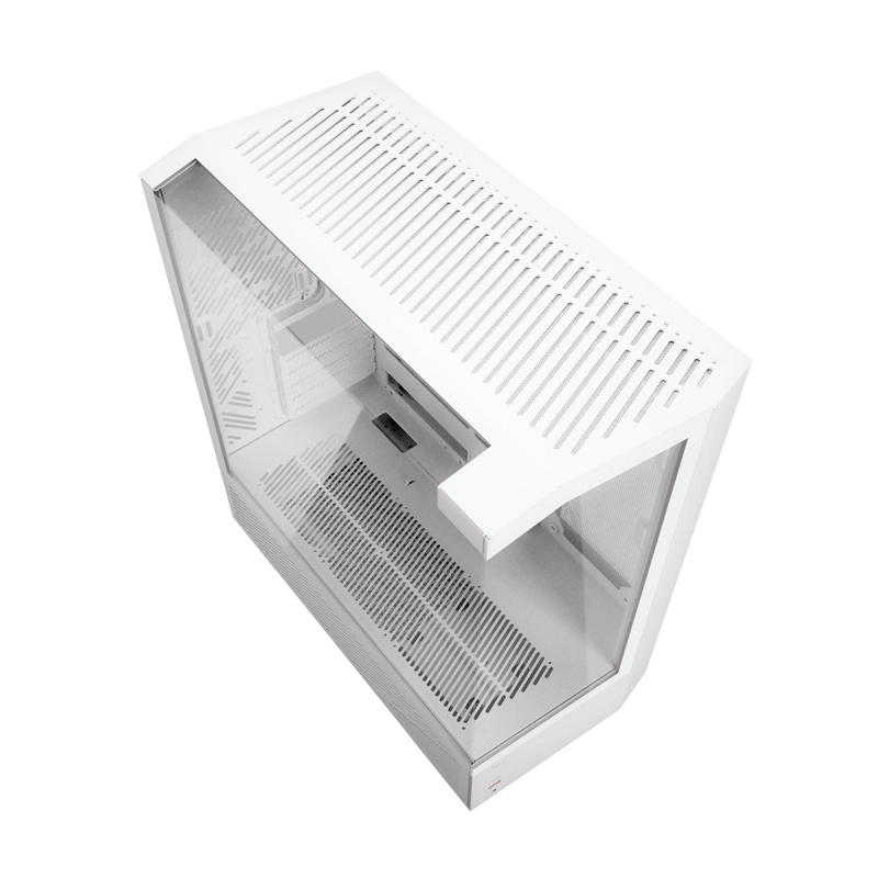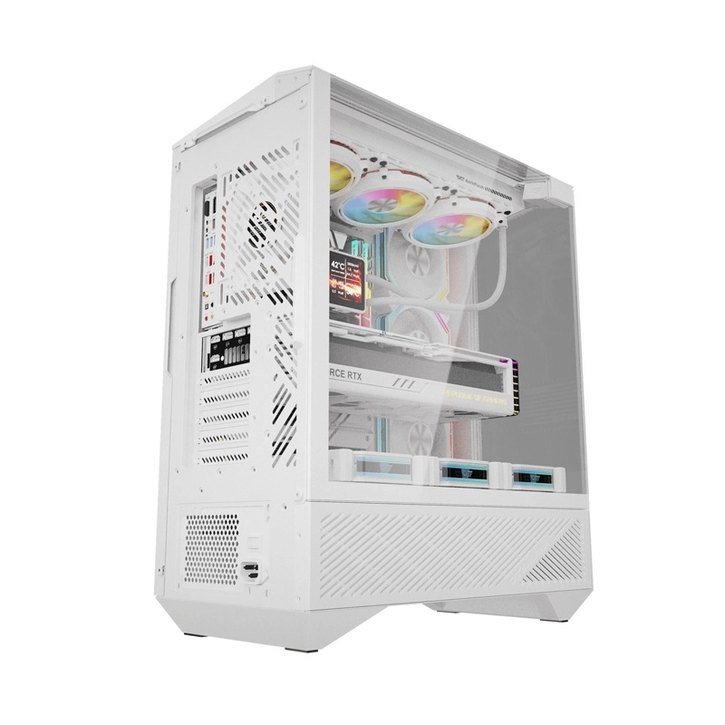 Pre tvorcov aj hráčov je k dispozícii USB‑C 3.2 Gen 2 (10 Gb/s), ďalej USB‑A 3.0 a HD Audio. Do priestranného interiéru jednoducho nainštalujete grafickú kartu až 400 mm (horizontálne) / 385 mm (vertikálne s príslušenstvom), chladič CPU do 185 mm a úložisko 2× 3,5" HDD + 1× 2,5" SSD. Robustná konštrukcia z 0,8 mm SPCC a účinné prachové filtre zaistia dlhú životnosť a tichú prevádzku.