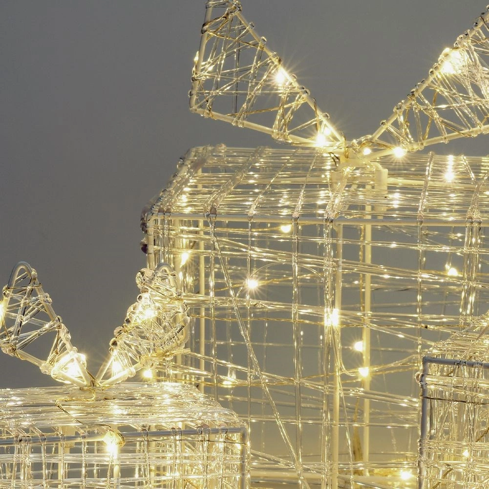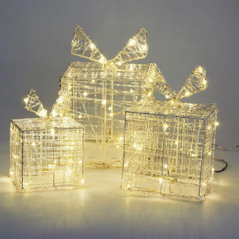 Vytvorte si doma aj vonku kúzelnú vianočnú atmosféru so sadou troch dekoratívnych darčekov s LED osvetlením. Kombinácia bieleho kovu a číreho akrylu pôsobí moderne a čisto, teplé biele svetlo LED dodáva dekorácii príjemný, slávnostný nádych. Vďaka rôznym veľkostiam darčekov ľahko pripravíte pôsobivú kompozíciu pri stromčeku, na terase, v hale či vo výklade.
