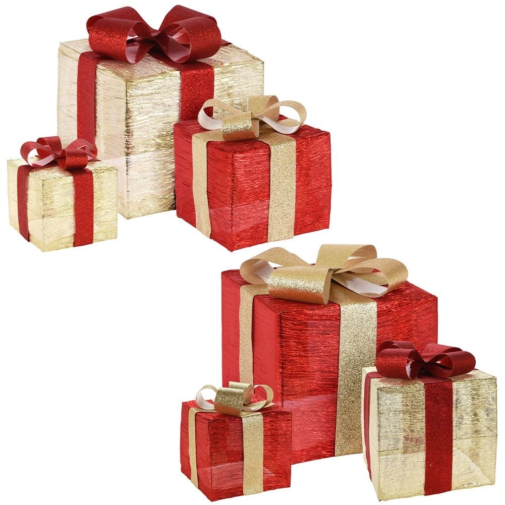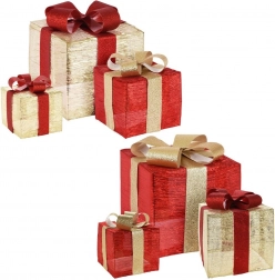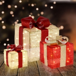 Elegantná súprava troch svietiacich darčekových krabíc v kombinácii zlatej a červenej farby nádherne podčiarkne vianočnú výzdobu doma, v kancelárii aj v reštaurácii. Každá krabica je omotaná glitterovou stuhou s mašľou a má teplé biele LED, ktoré navodia čarovnú atmosféru.
