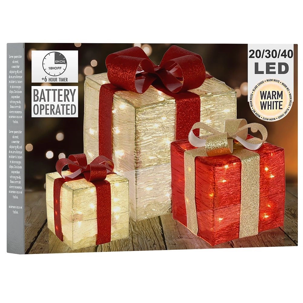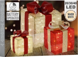 Vytvorte sviatočnú atmosféru so súpravou troch dekoratívnych darčekov so zabudovanými teplými LED. Rôzne veľkosti, trblietavá povrchová úprava, časovač 6/18 h a batériové napájanie pre jednoduché umiestnenie kdekoľvek v interiéri.