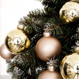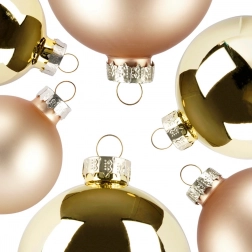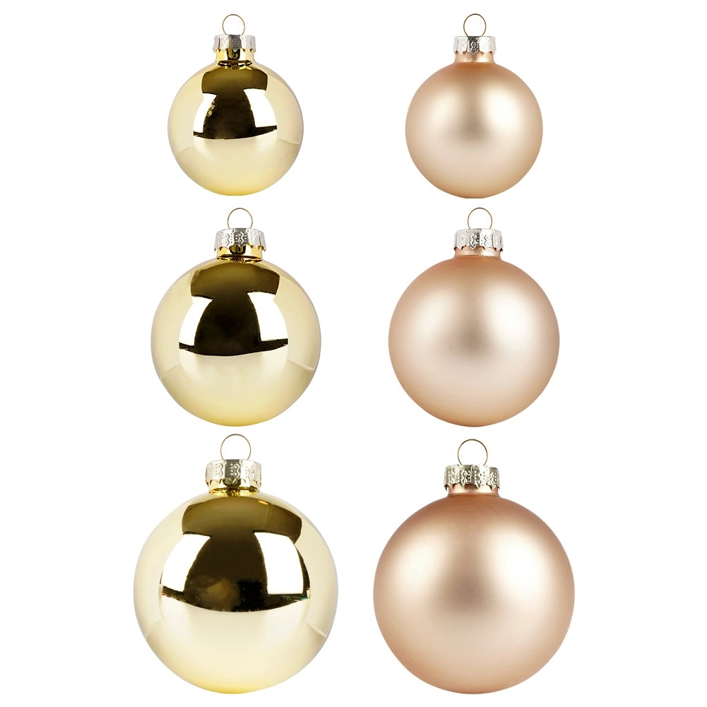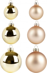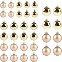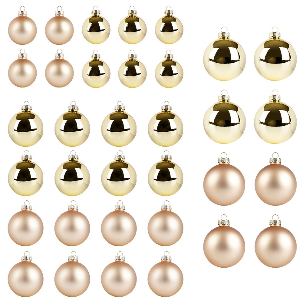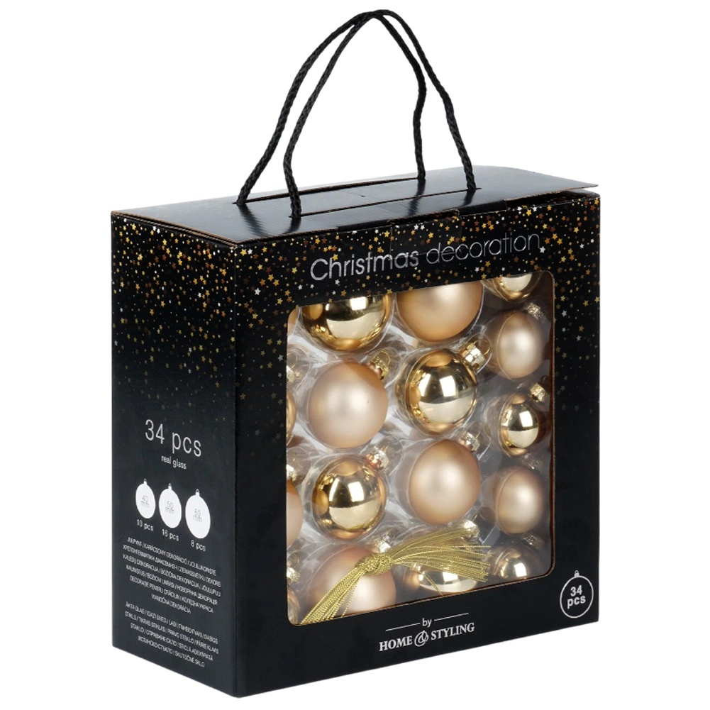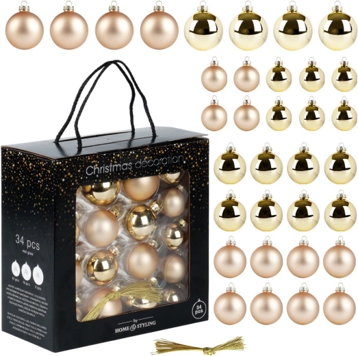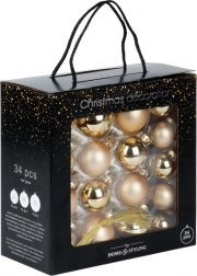 Sada obsahuje 34 precízne vyrobených sklenených ozdôb v zlatej farbe, ktoré dodajú každému interiéru nádych elegancie. Kombinácia matného a lesklého finišu vytvára pôsobivý kontrast a krásne odráža svetlo vianočných reťazí.