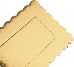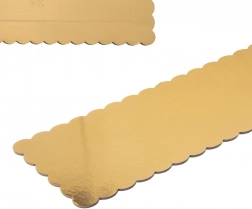 Elegantná zlatá podložka pod tortu s rozmerom 33 × 12 cm so zdobným vlnkovaným okrajom. Je obojstranná, vyrobená z pevnej lepenky a potiahnutá ochrannou fóliou z oboch strán, takže odolá vlhkosti a je vhodná aj do chladničky. Poskytuje stabilnú oporu na prenášanie a bezpečný transport tort aj ťažších zákuskov a zároveň zabezpečuje reprezentatívne servírovanie.