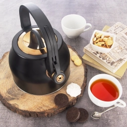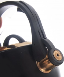Štýlová kanvica z nehrdzavejúcej ocele v kombinácii čiernej a zlatej sa stane ozdobou modernej aj klasickej kuchyne. Vďaka širokému stabilnému základu a kvalitnému materiálu zohreje vodu rýchlo a úsporne, bez ovplyvnenia jej chuti. Odklápacia píšťalka spoľahlivo upozorní na var, zatiaľ čo pohodlné, tepelne odolné madlo zaistí bezpečný úchop.