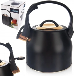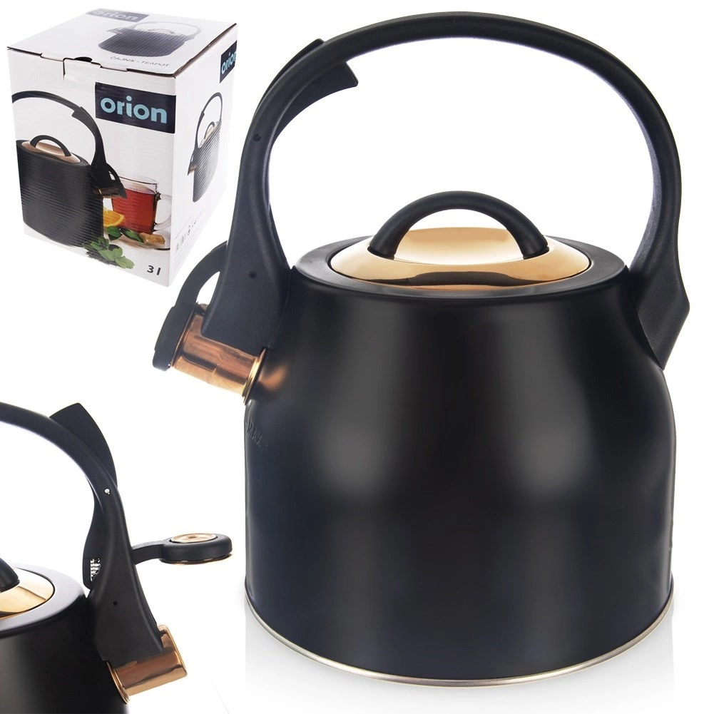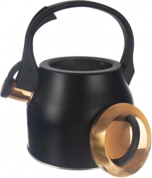 Elegantná oceľová kanvica s píšťalkou v matnej čiernej so zlatými akcentmi kombinuje štýl a funkčnosť. Má objem 3 l (užitočný 1,8 l), ergonomické madlo, odklápaciu píšťalku a ľahko snímateľné veko. Vhodná na všetky typy sporákov vrátane indukcie a skvele sa hodí na každodenné varenie vody na čaj, kávu aj bylinky.