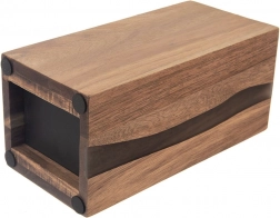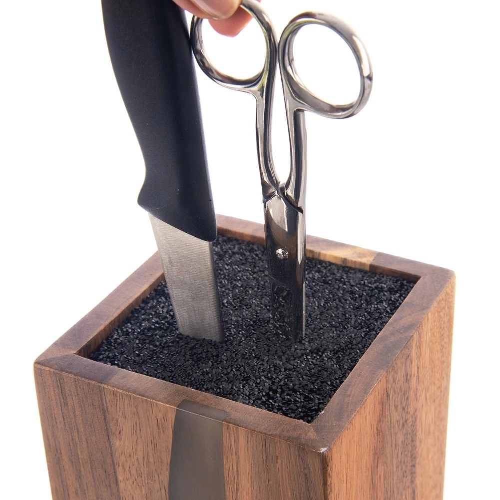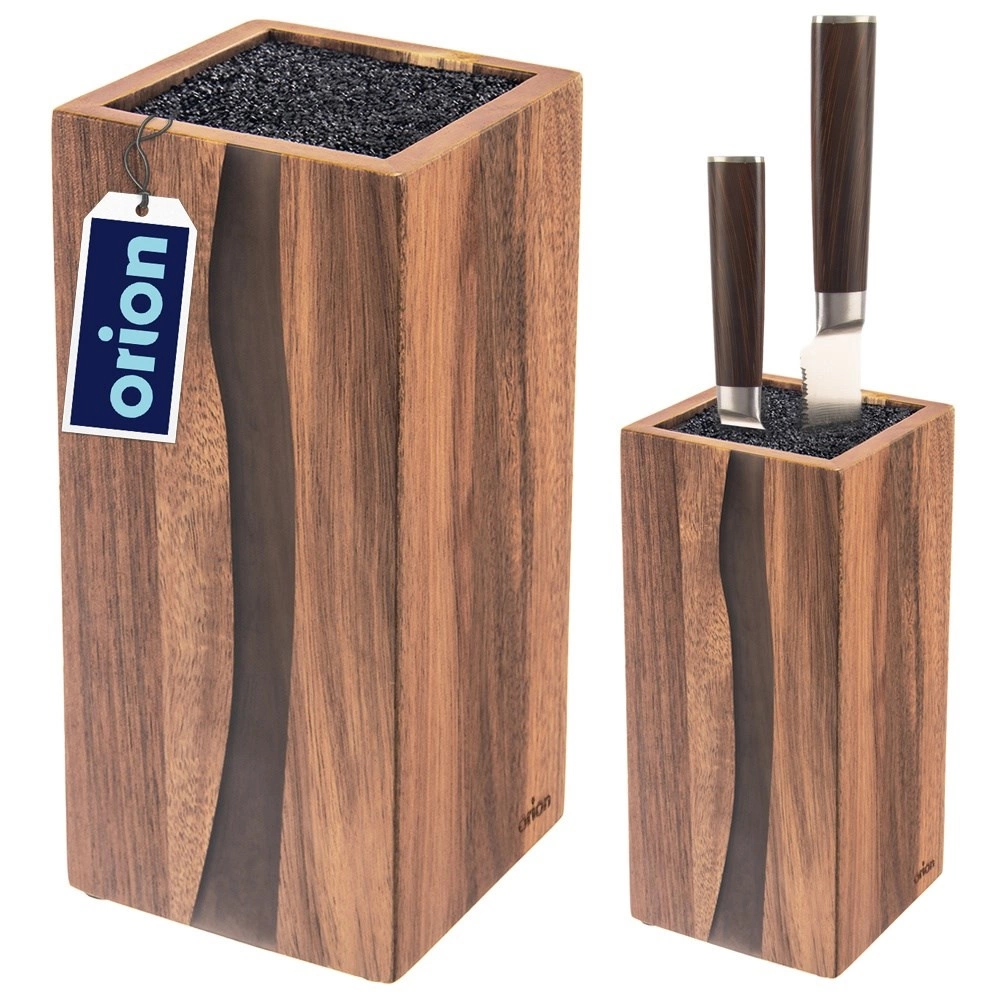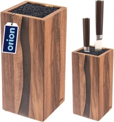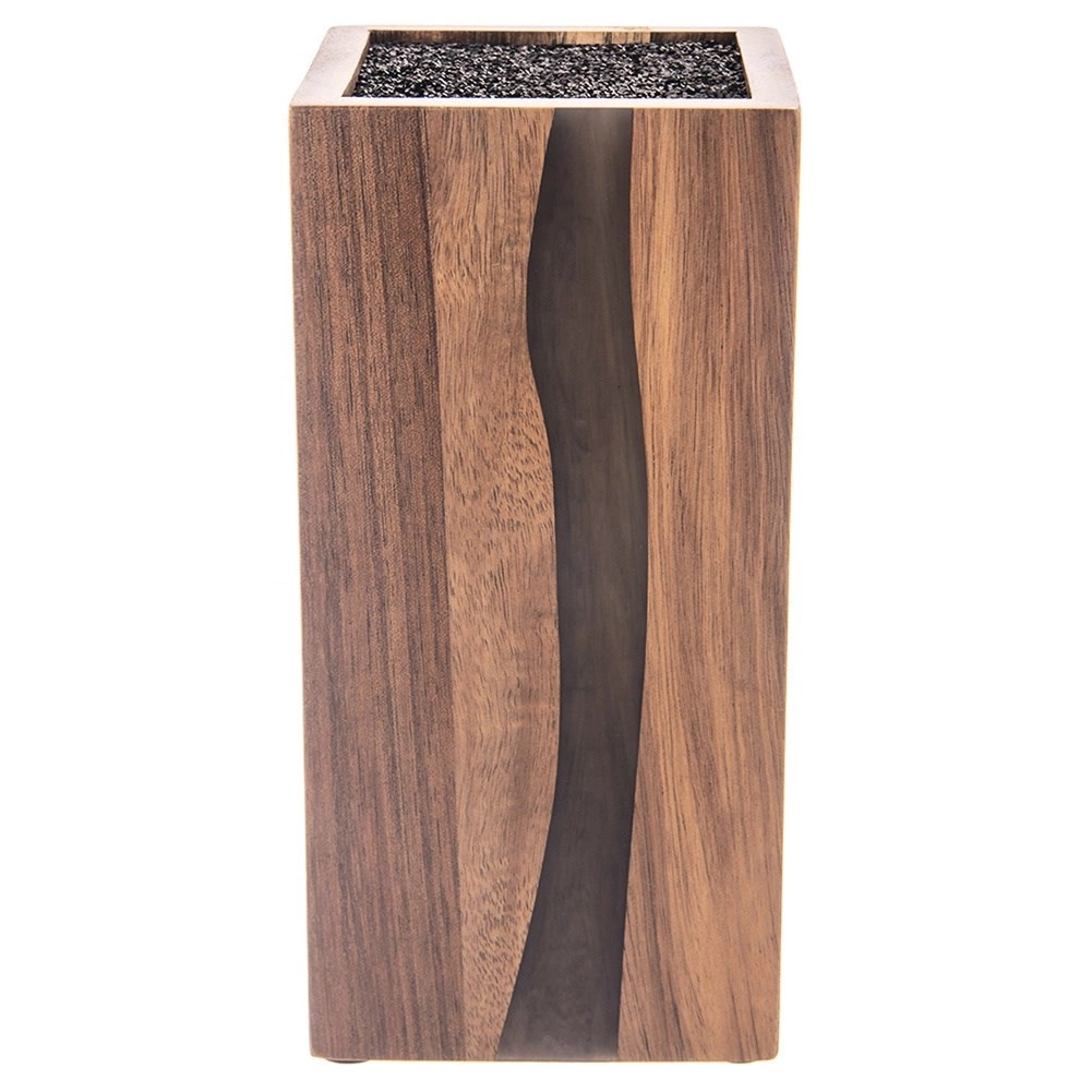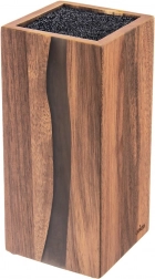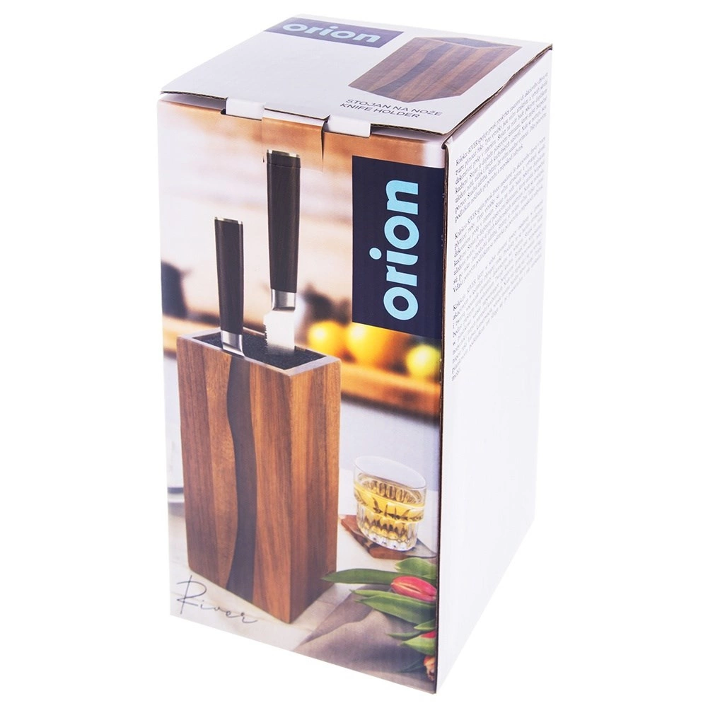 Štýlový a funkčný blok na nože RIVER je vyrobený z kvalitného akáciového dreva s dekoratívnou živicou, ktorá svojím tvarom pripomína riečnu líniu. Vďaka univerzálnemu čiernemu vláknu vo vnútri možno zasunúť nože ľubovoľných veľkostí a tvarov, vrátane keramických a oceľových, a tiež nožnice či menšie kuchynské náradie. Vláknitá vložka drží čepele bezpečne, bez pevne daných štrbín, a minimalizuje otupenie ostria.