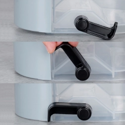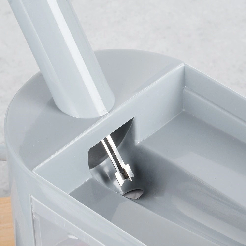 Kompaktný dizajn (cca 20 × 10 × 27 cm) šetrí miesto a uľahčuje skladovanie. Prístroj je vyrobený z kvalitného plastu v sivej a transparentnej úprave, je odolný a ľahký, a po práci ho jednoducho vložíte do umývačky riadu. V balení navyše nájdete 2 náhradné gumové vložky pre dlhú životnosť a presné vedenie plodu.