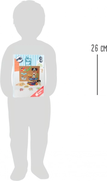 Objavte zábavnú zatĺkaciu hru s pirátskymi motívmi od small foot, ktorá podporuje kreativitu, koncentráciu a jemnú motoriku. Vďaka pružnej korkovej doske, zlatým pripináčikom a bohatému výberu drevených dielikov vytvoria deti jedinečné obrazy. Praktický úložný box a štyri obojstranné karty s motívmi zaistia jednoduché ukladanie aj inšpiráciu na tvorenie.