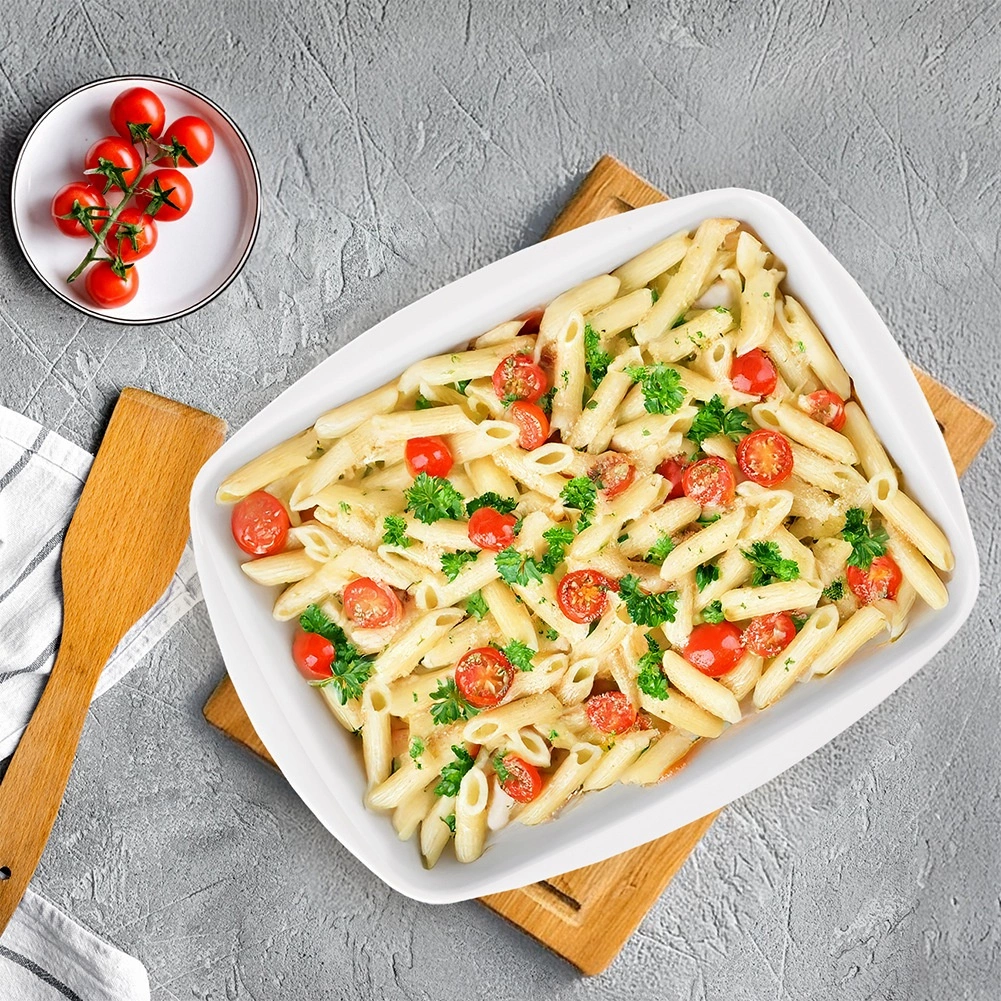 Táto priestranná porcelánová misa je skvelou voľbou na prípravu lasagní, zapekaných zemiakov, zeleniny, mäsa aj sladkých dezertov. Hladký vnútorný povrch zabezpečí ľahké vyklopenie pokrmov a pohodlné čistenie. Vďaka nadčasovému bielemu prevedeniu môžete jedlá rovno štýlovo servírovať na stôl.
