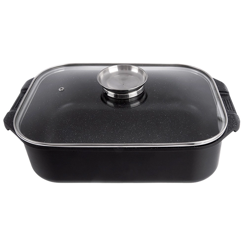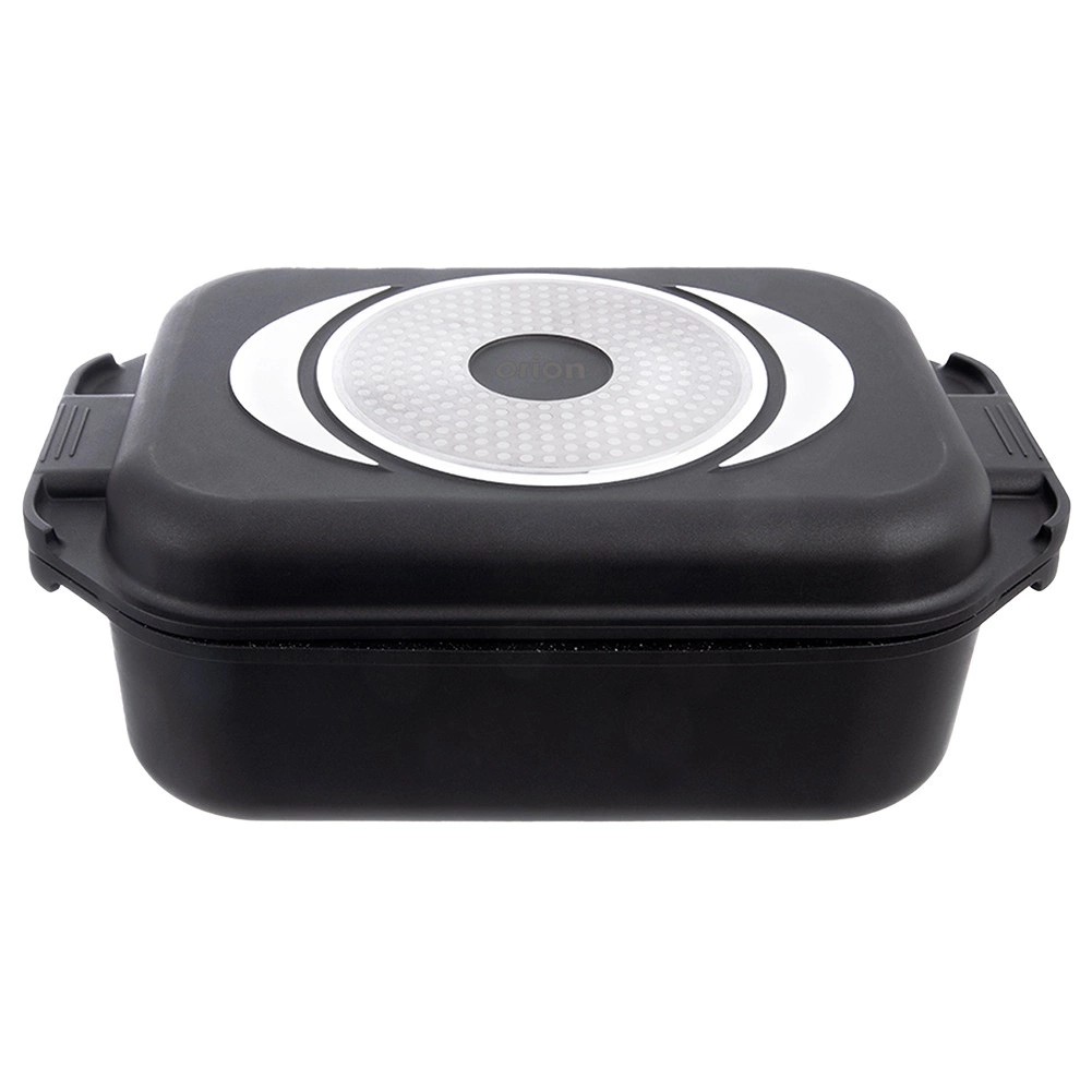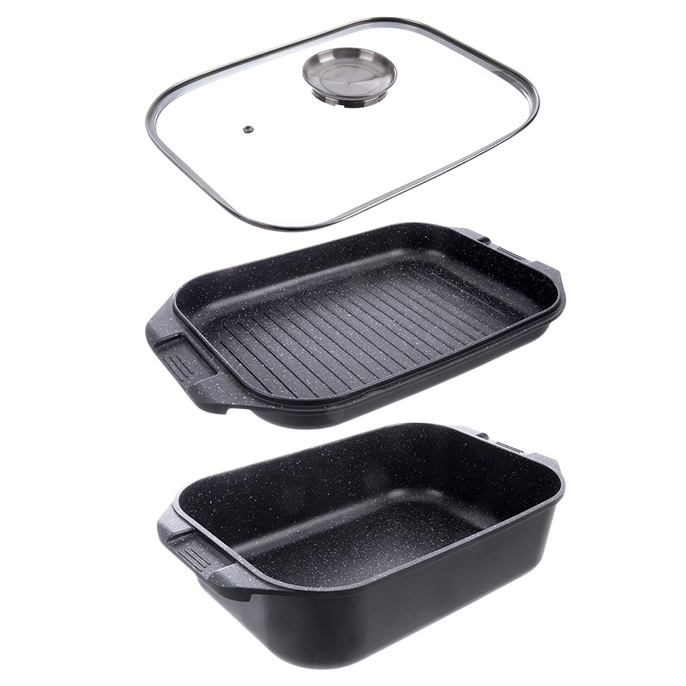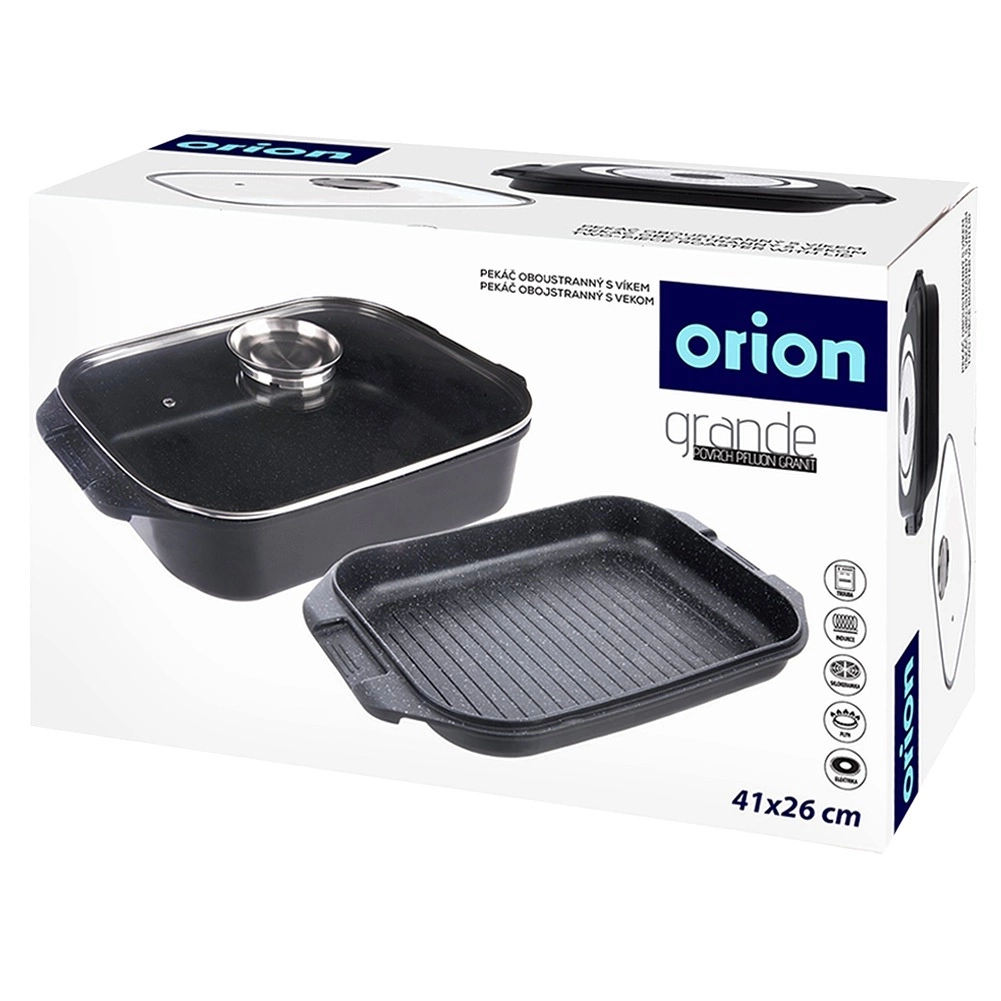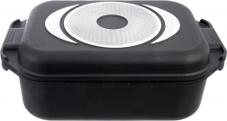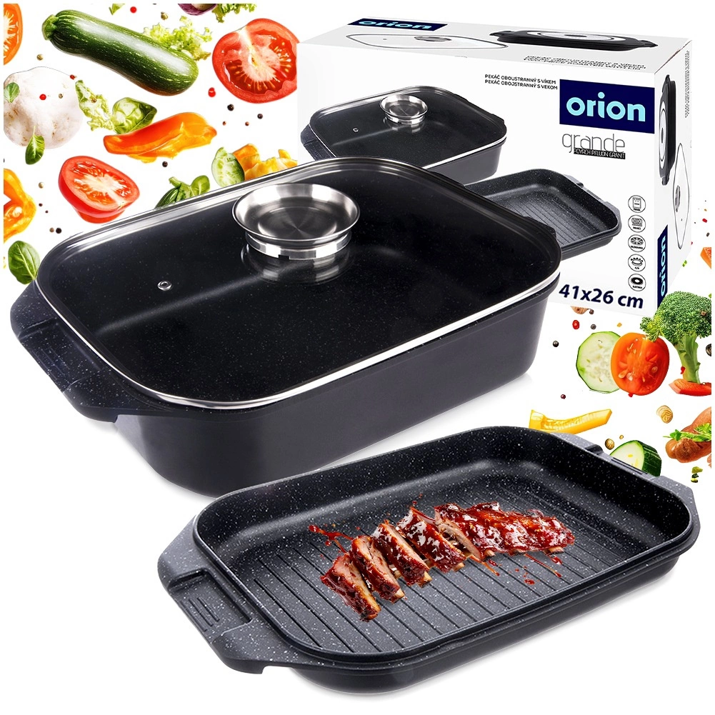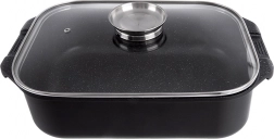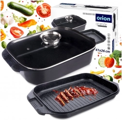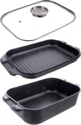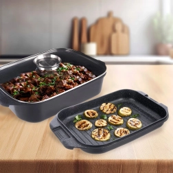 Grilovaciu panvicu môžete používať samostatne alebo ako veko misy – ideálna na vyprážanie, pečenie aj dusenie. Sklenené veko s praktickým dávkovačom umožní prilievať vodu, víno či tekuté koreniny bez dvíhania veka. Vonkajšia strana je opatrená nepriľnavou vrstvou PTFE pre jednoduchú údržbu.