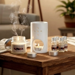 Vytvorte si doma atmosféru pokoja a pohody s touto kompletnou sadou na aromaterapiu. Obsahuje keramickú aromalampu, 4 vonné oleje s vôňou santalového dreva, 2 čajové sviečky a vonnú sviečku v skle. Elegantné prevedenie a darčekové balenie z nej robia ideálny darček aj skvelý doplnok pre domáce SPA.