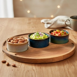 Reaktívna glazúra dáva každej miske originálny odtieň a vzor, takže váš stôl bude vždy vyzerať výnimočne. Podnos z akáciového dreva dodáva teplý prírodný akcent a uľahčuje pohodlné prenášanie. Mištičky možno používať samostatne a po hostine ich jednoducho vložíte do umývačky.