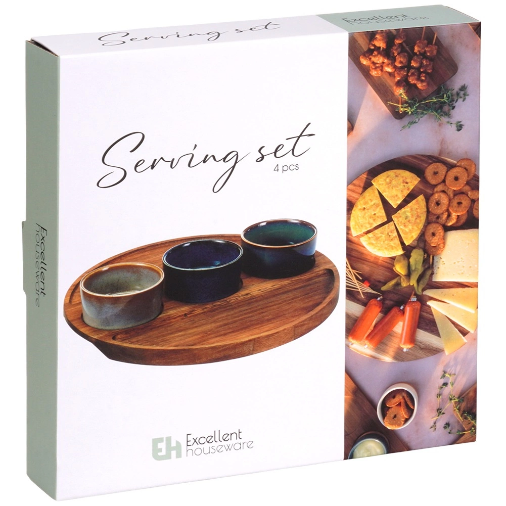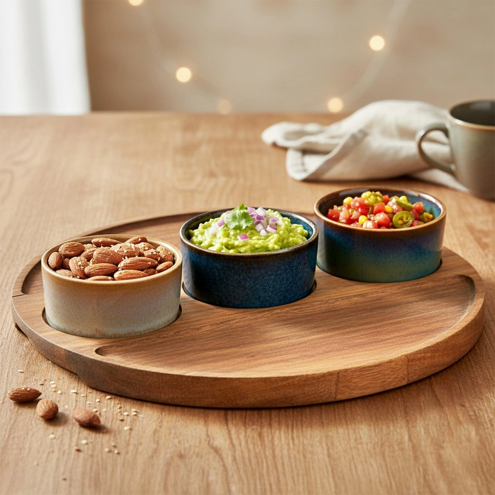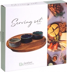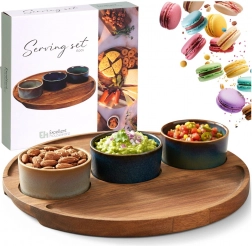 Štýlová 4-dielna sada na servírovanie s dreveným podnosom a tromi keramickými mištičkami je ideálna na olivy, oriešky, dipy a antipasti. Každá miska má unikátnu glazúru, podnos z akáciového dreva má vyfrézované prehlbiny pre stabilitu. Rozmery setu 25 × 25 × 4,5 cm, mištičky 7 × 3 cm, objem 65 ml. Mištičky sú vhodné do umývačky (bez podnosu).