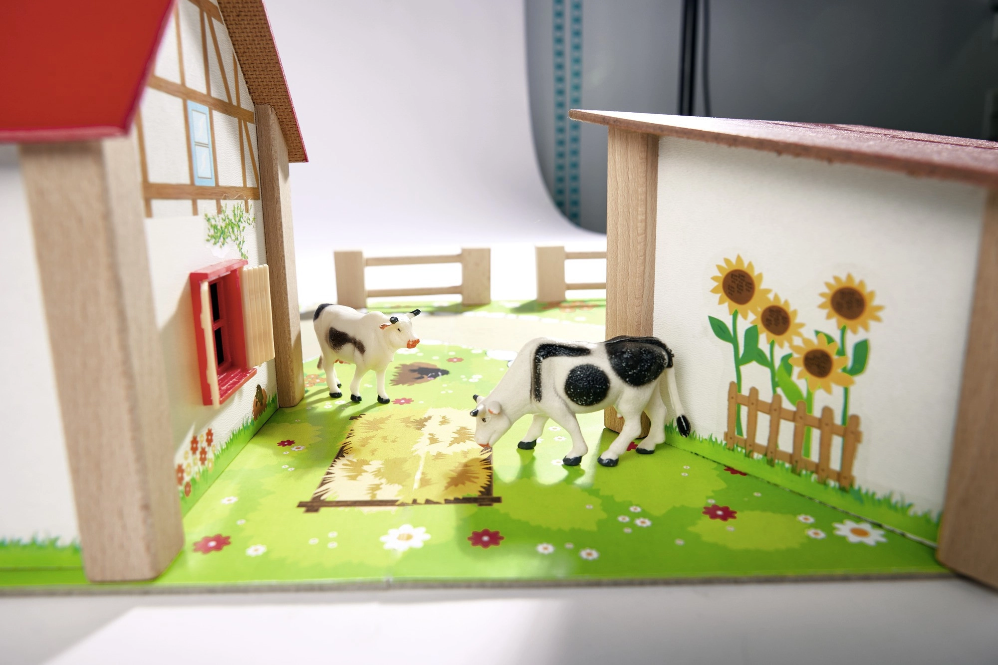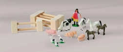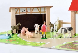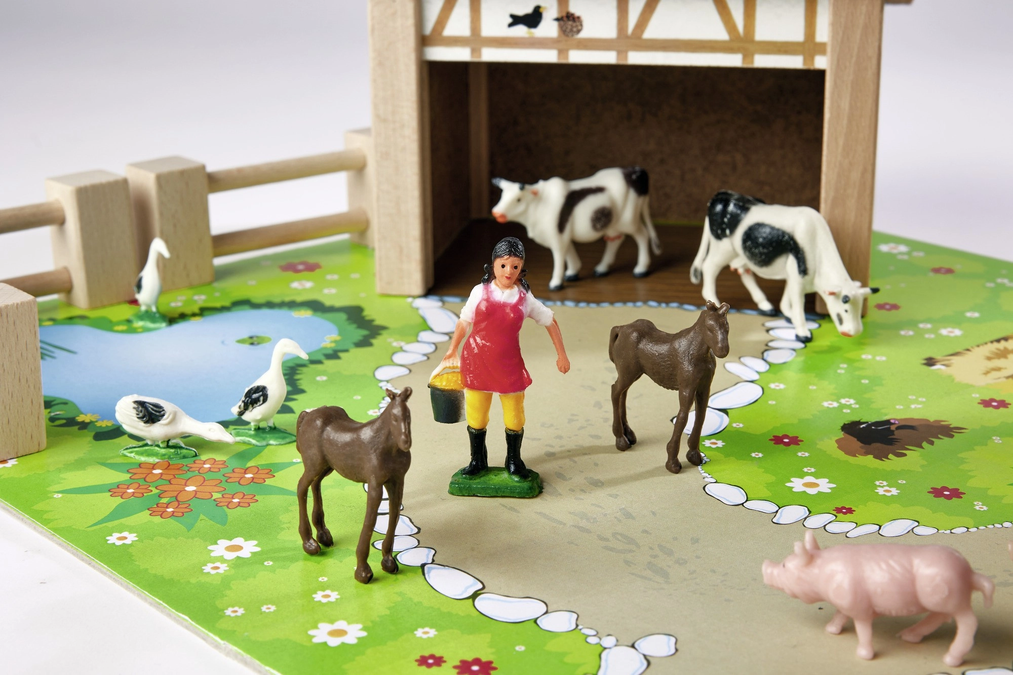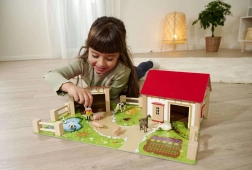 - Dom so stodolou a maštaľou, farebná podložka, ploty, nálepky, 12 figúrok (zvieratá a postavička farmára)