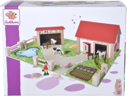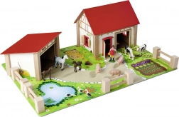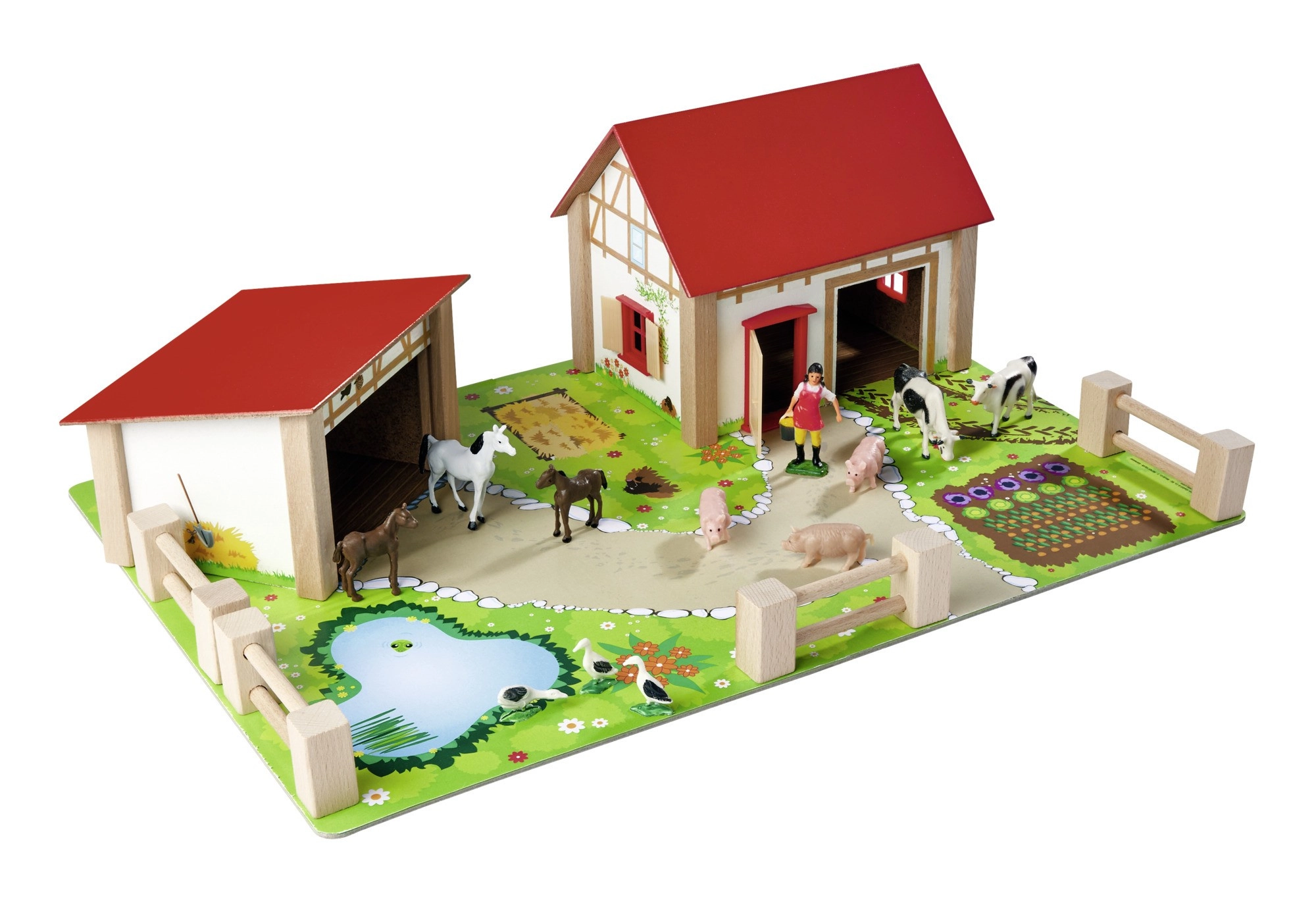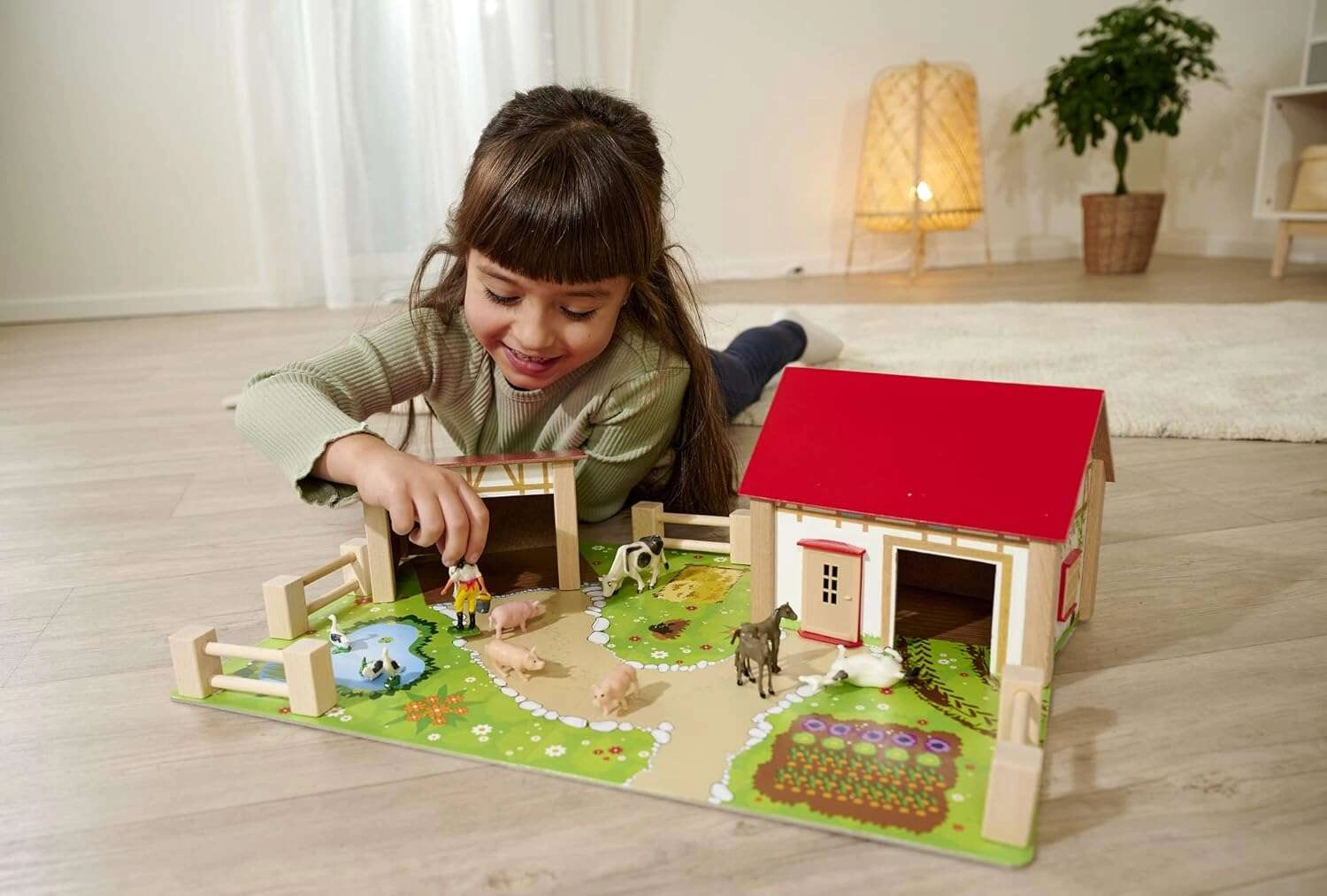 Objavte kúzlo vidieka s drevenou farmou EICHHORN, ktorá prináša 25 dielov pre kreatívne hranie. Robustné drevené budovy, pohyblivé ploty a roztomilé figúrky zvierat pozývajú deti k fantázii, rozvoju jemnej motoriky a logického myslenia. Farebná podložka so cestičkami, jazierkom a záhradkou vytvára realistickú scenériu farmy.