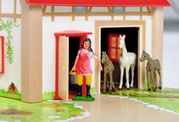 Veľká stodola s maštaľou, otváracími prejazdmi a ohradami vytvára autentické prostredie. Deti môžu zvieratá kŕmiť, vodiť do výbehov a organizovať život na farme.
