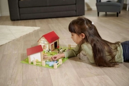 Potlačená základňa vedie deti k tvorbe vlastných scenárov – cesty prepájajú budovy, jazierko a záhonky dodávajú hre realistické detaily.