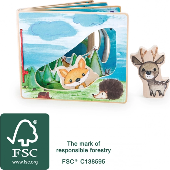 Vstúpte do hlbokého lesa s interaktívnou drevenou knihou, ktorá stimuluje fantáziu detí. Vďaka figúrkam líšky a jeleňa, ktoré pomáhajú objavovať flóru a faunu, sa stane každá hra jedinečným zážitkom.<