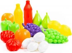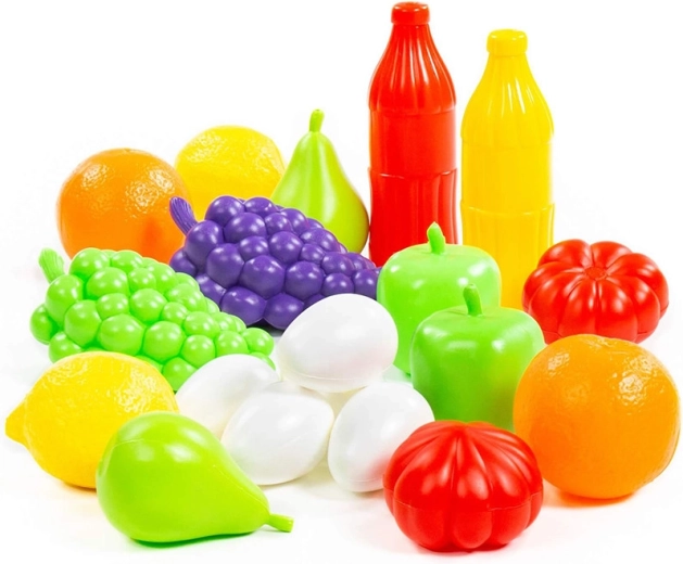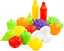 Sada obsahuje hrozno, jablká, citrusy, paradajky a ďalšie kúsky, ktoré podnecujú fantáziu a učia deti rozlišovať druhy potravín a farby.
