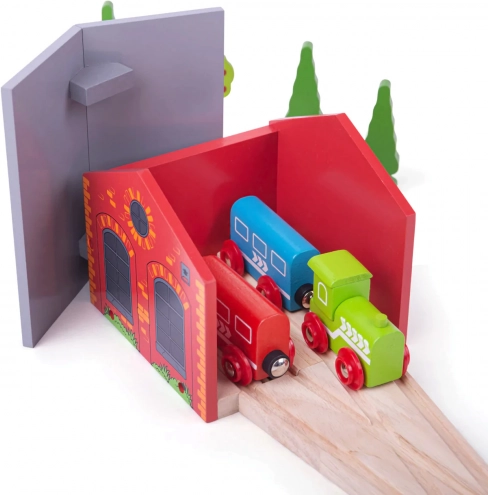 Rozšírte svoje koľajisko o štýlové tehlové depo, do ktorého pohodlne zaparkujete až dva vláčiky. Vďaka priloženej vjazdovej koľaji depo jednoducho napojíte na existujúcu trať a vytvoríte realistické zázemie na odpočinok, údržbu či tankovanie súprav. Robustná drevená konštrukcia a nadčasový dizajn zaručia dlhú životnosť a bezpečnú hru.