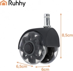 Kolieska RUHHY prinášajú komfort a bezpečie pre vašu podlahu aj stoličku. Vďaka mäkkému PU povrchu sa hladko odvaľujú po paneloch, parketách, dlažbe aj koberci bez zanechávania škrabancov. Oceľové ložisko a zosilnená konštrukcia zaručujú dlhú životnosť a spoľahlivosť pri každodennom používaní.