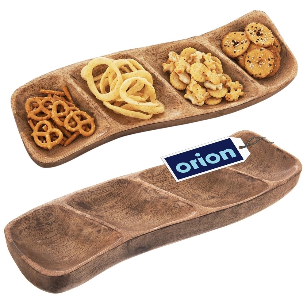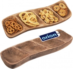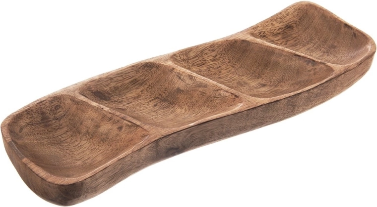 Elegantný drevený tanier na servírovanie so 4 priehradkami z odolného mangového dreva. Ručne vyrobený, s prírodným dekorom a univerzálnym využitím na oriešky, olivy, sušené ovocie, dipy a omáčky. Štýlová prezentácia občerstvenia doma aj v reštaurácii.