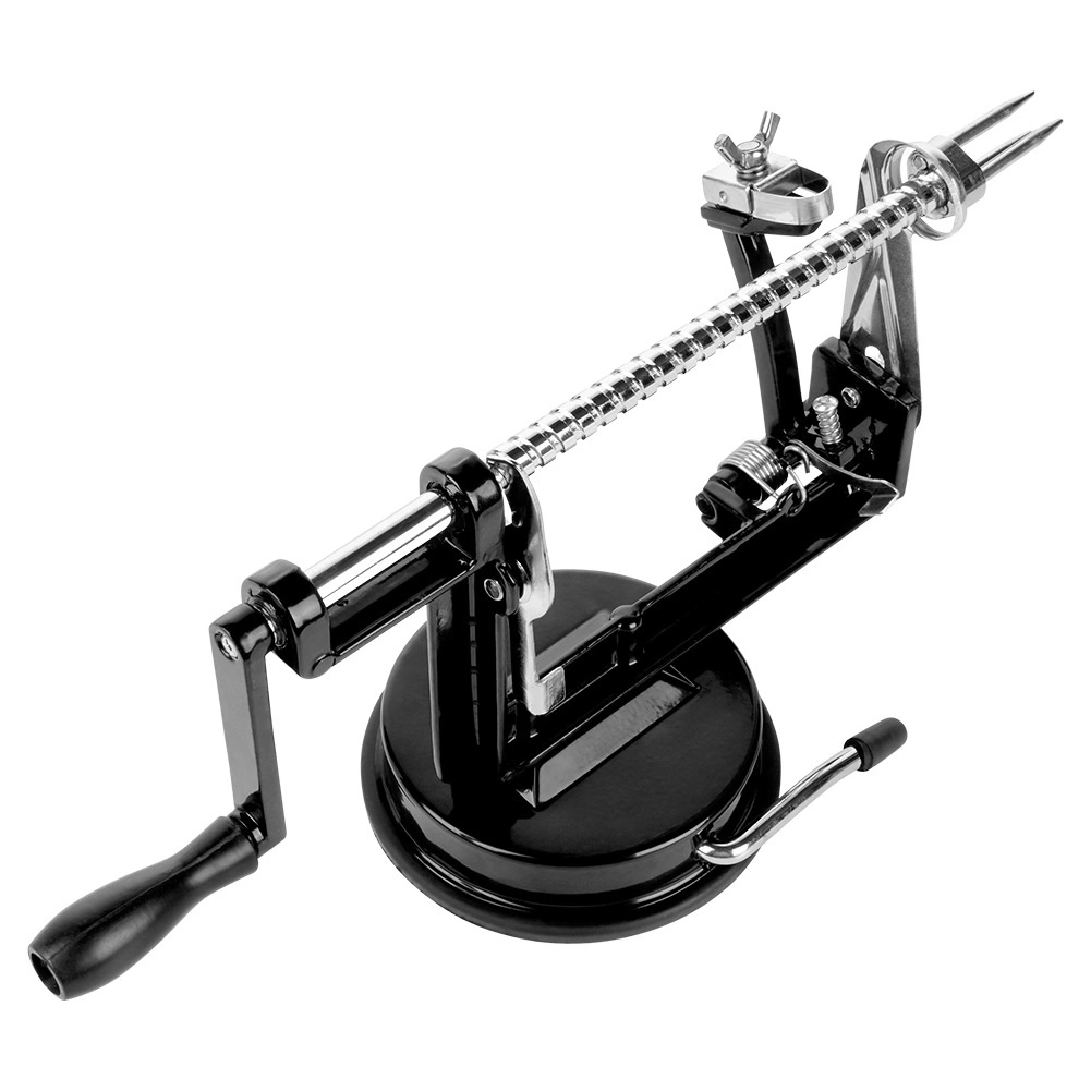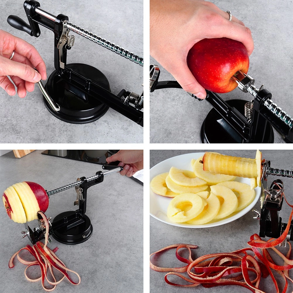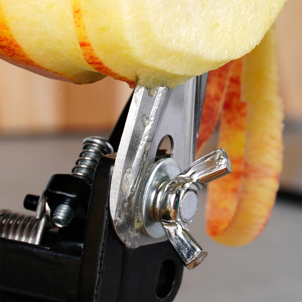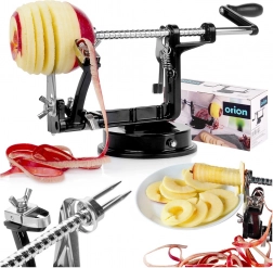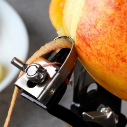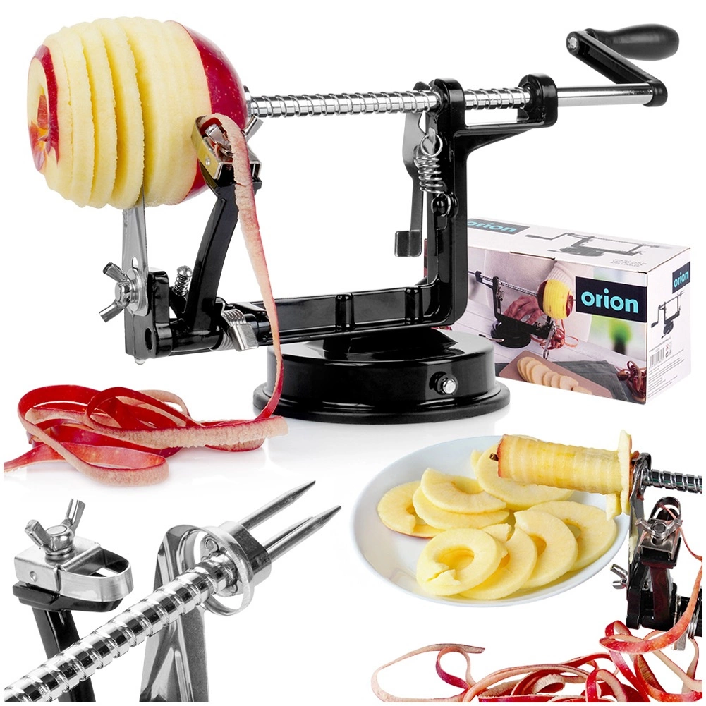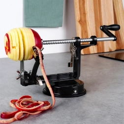 Praktický kuchynský pomocník, ktorý v jednej operácii ošúpe, vykrojí jadrovník a nakrája jablká, hrušky či zemiaky na efektné špirály. Vďaka presnému vedeniu a ostrým nožom získate pravidelné plátky ideálne na štrúdle, chrumkavé chipsy, sušenie či dekoratívne servírovanie.