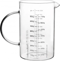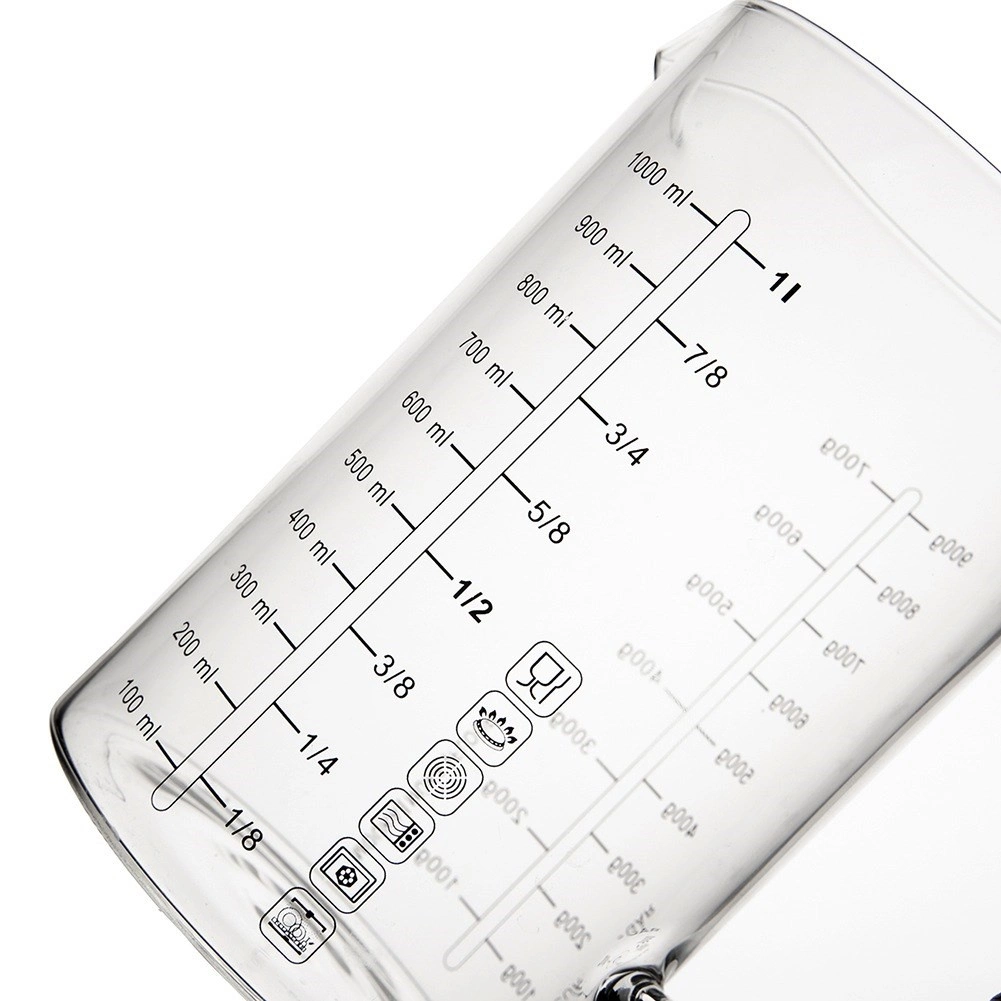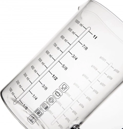 Stupnice sú dobre čitateľné a umožňujú rýchle a spoľahlivé odmeriavanie. Nájdete tu meranie tekutín v ml (100–1000 ml) a v litroch (1/8 l – 1 l), rovnako ako prepočty pre múku (100–700 g) a cukor (100–900 g). Maximálna označená kapacita je 1 l, skutočný objem džbánika je až 1,2 l.