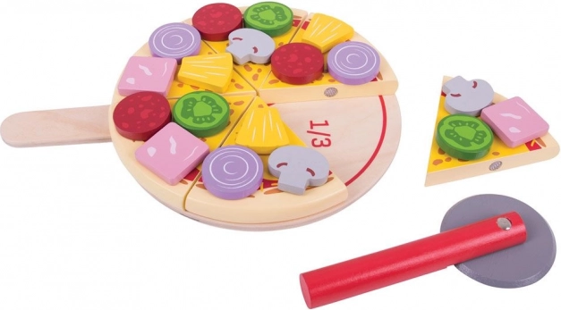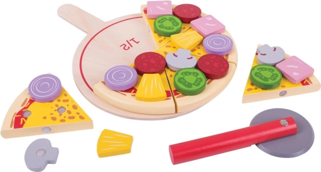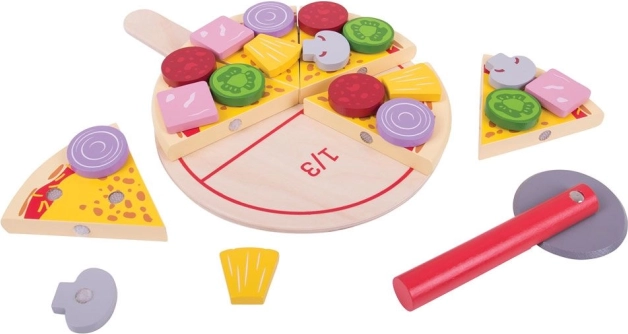 Šesť plátkov pizze so spojmi na suchý zips drží pokope a dá sa „ukrojiť“ dreveným krájačom. Deti si vyskúšajú realistické krájanie a servírovanie.