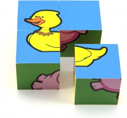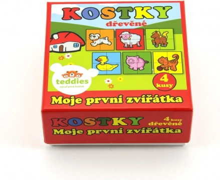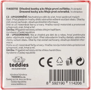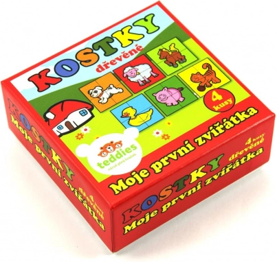 Drevené kocky TEDDIES Moje prvé zvieratká: 4 kocky, 6 obrázkov. Odolná hračka na rozvoj motoriky a fantázie. Vyrobené v ČR.