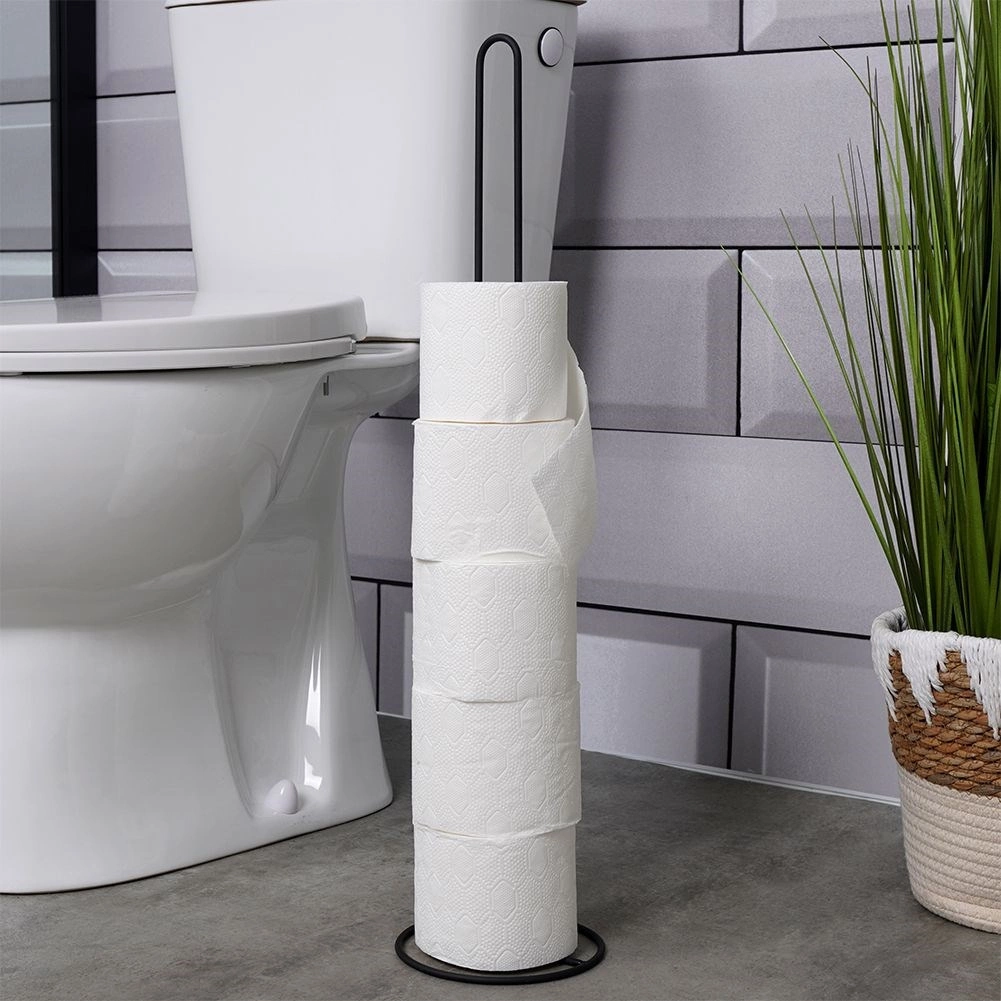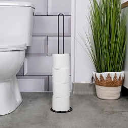 Elegantný a praktický stojan na toaletný papier s kapacitou až 6 rolí šetrí miesto a udržiava všetko po ruke. Vďaka stabilnej kruhovej základni a kvalitnému kovovému prevedeniu v matnej čiernej farbe je odolný, stabilný a ideálny do moderných aj klasických kúpeľní. Bez vŕtania a montáže – ihneď pripravený na použitie.