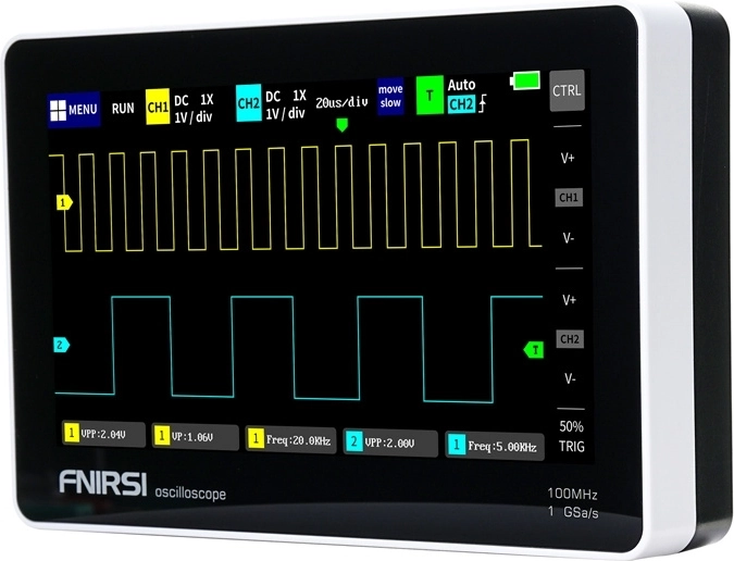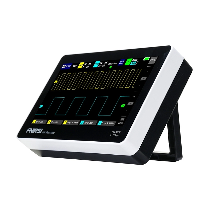 FNIRSI 1013D je praktický prenosný osciloskop na presnú analýzu analógových aj digitálnych signálov. 7-palcový kapacitný TFT displej (800 × 480) zabezpečuje jasné zobrazenie priebehov, rýchle priblíženie a intuitívnu úpravu parametrov. Dva nezávislé kanály s 1 MΩ vstupnou impedanciou umožnia súčasné porovnávanie signálov, vrátane analýzy Lissajousových obrazcov v režime XY.
