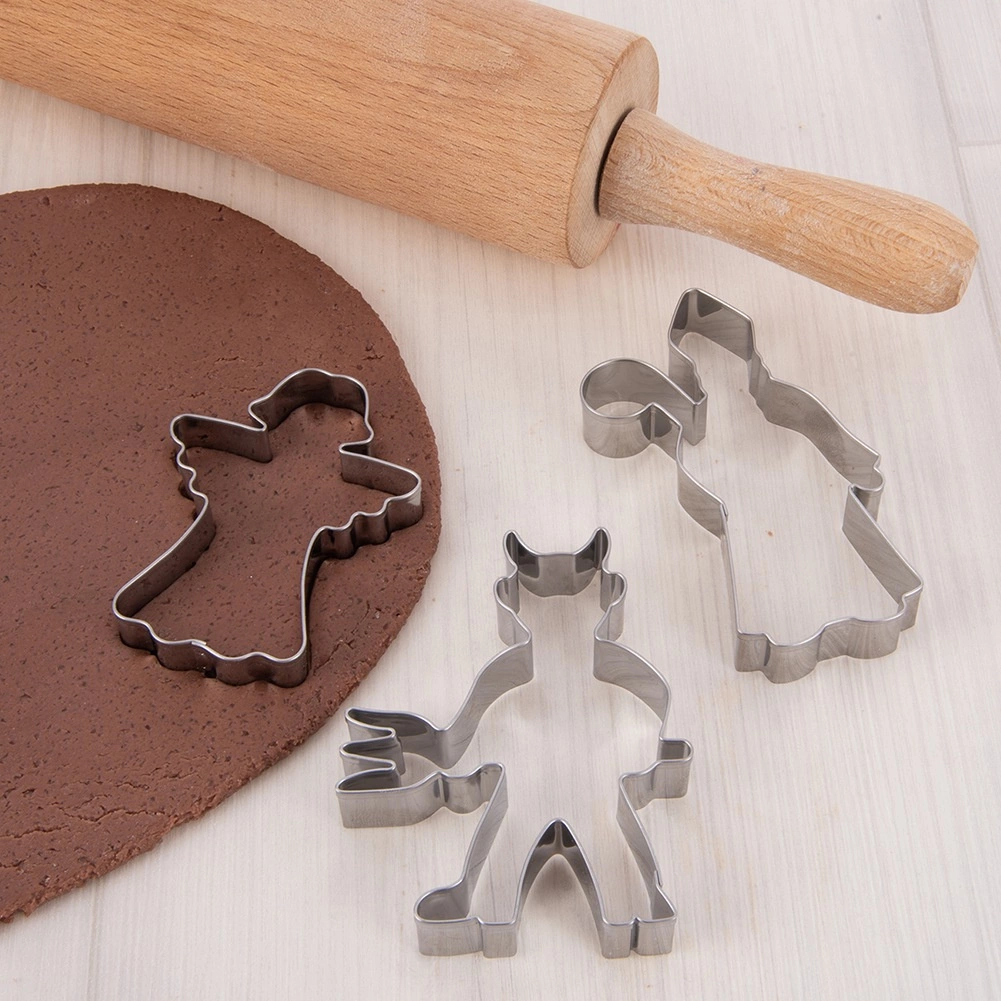 Štýlová súprava 3 vykrajovačiek prinesie do vašej kuchyne tú pravú sviatočnú atmosféru. Vďaka pevnému prevedeniu z nehrdzavejúcej ocele ľahko vytvoríte presné obrysy a hladké okraje perníčkov aj sušienok. Vykrajovačky sú skvelé tiež na fondán, marcipán či cesto na sušienky.